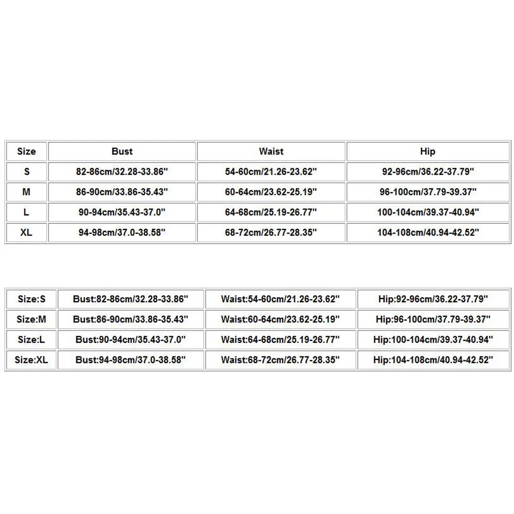 Size Bust Waist Hip S 82-86cm/32.28-33.86" 54-60cm/21.26-23.62" 92-96cm/36.22-37.79" M 86-90cm/33.86-35.43" 60-64cm/23.62-25.19" 96-100cm/37.79-39.37" L 90-94cm/35.43-37.0" 64-68cm/25.19-26.77" 100-104cm/39.37-40.94" XL 94-98cm/37.0-38.58" 68-72cm/26.77-28.35" 104-108cm/40.94-42.52"