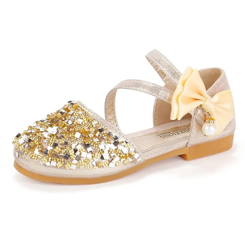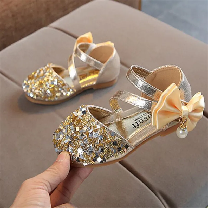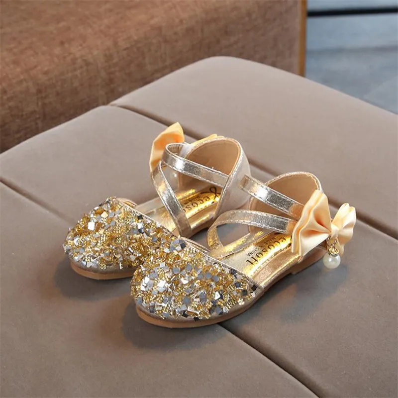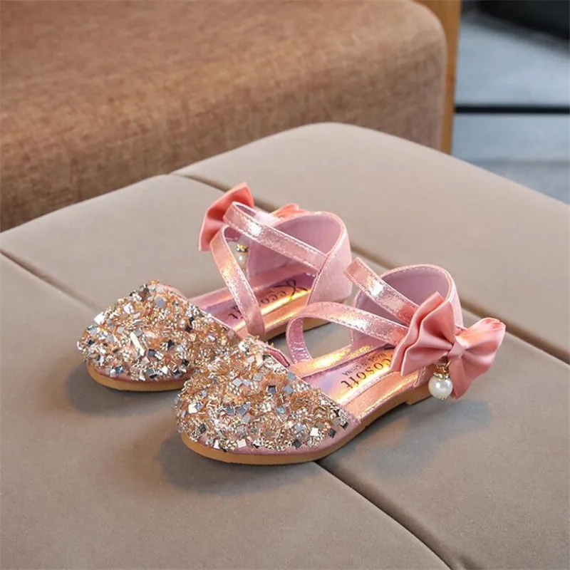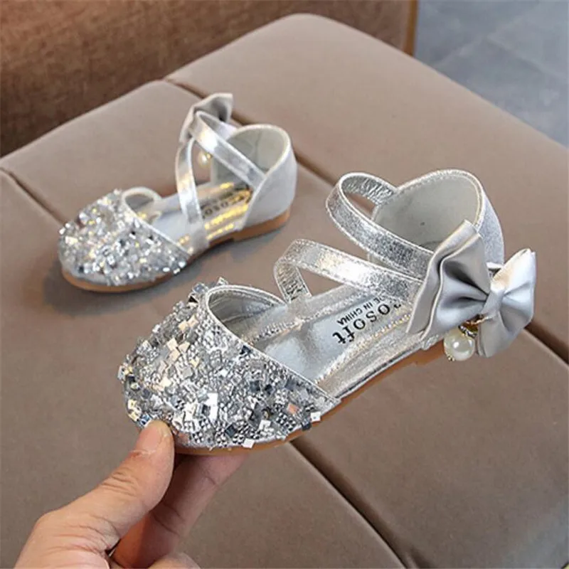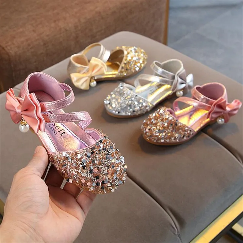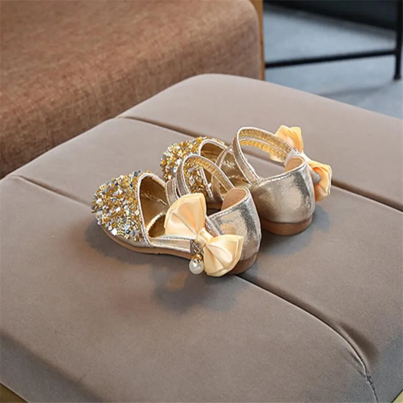 Детская кожаная обувь; Повседневные Вечерние туфли принцессы на плоской подошве для девочек; Модная детская обувь с блестками и бантом и жемчугом для девочек; Новинка 2020 года