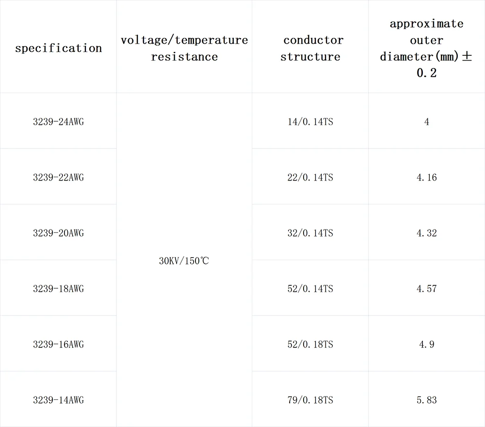 Проводник: Луженая медь Изолятор: силикон, цвет белый, красный. Номинальное напряжение: 3кВ или 30кв или 40кв или 50кв Диапазон температур: от-60 ℃ до + 150 ℃