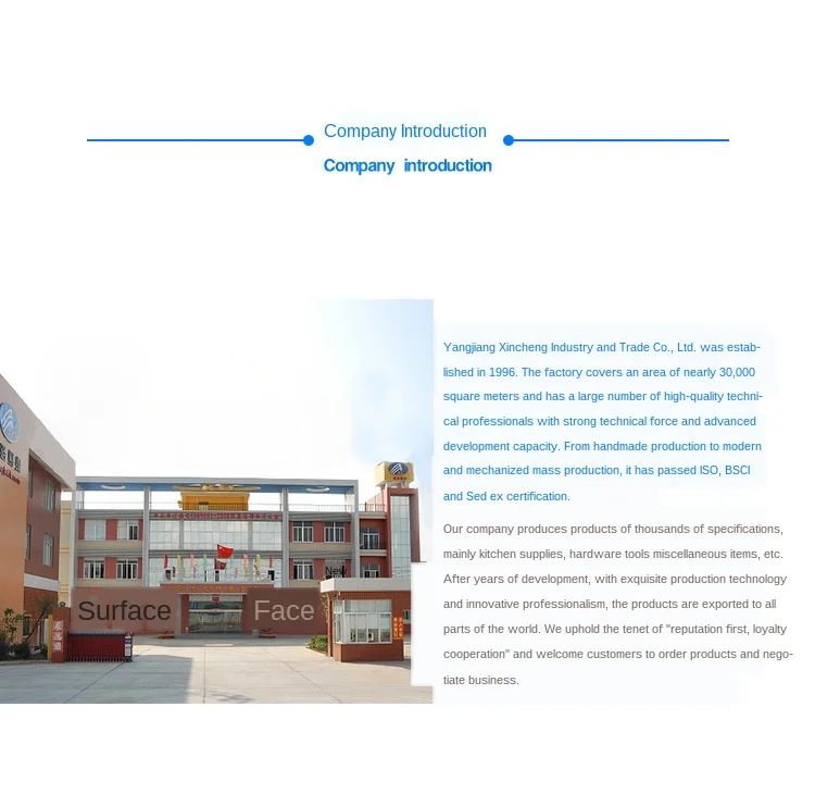 Yangjiang Xincheng industry and Trade Co., Ltd. была основана в 1996 году. Завод занимает площадь около 30 тысяч квадратных метров, с большим количеством профессионалов в области высоких технологий, сильной технической силой и передовыми возможностями развития. От производства ручной работы до модернизированного и механизированного крупномасштабного производства, он был сертифицирован ISO, BSCI и Sedex.