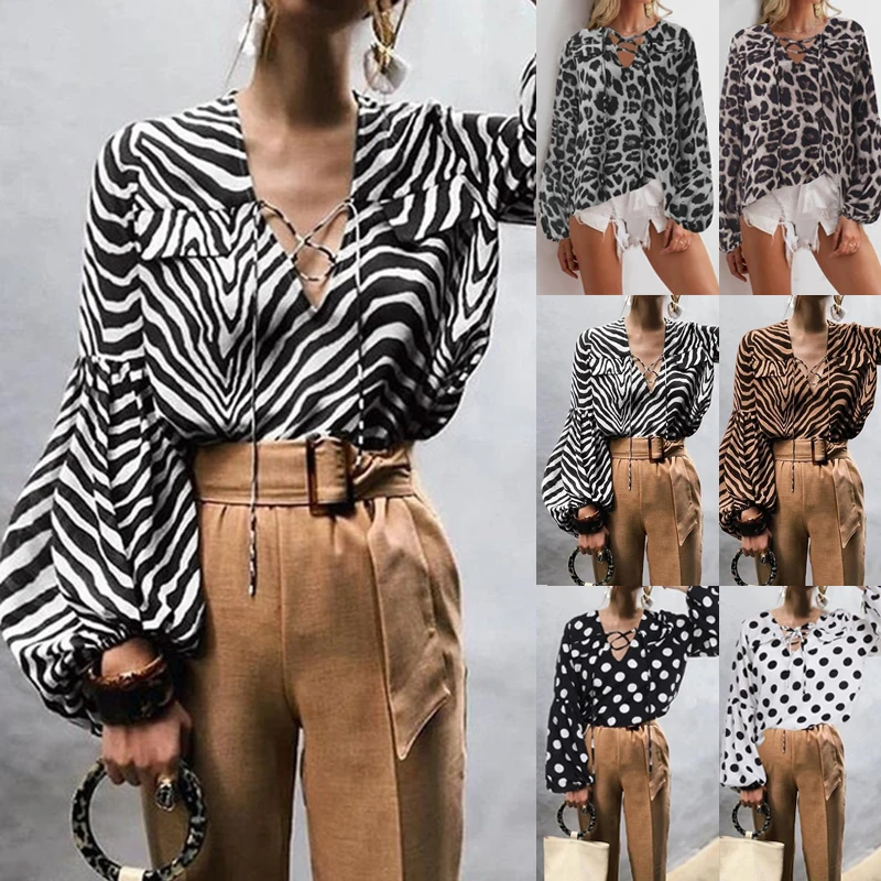 Женская Свободная блузка в горошек с леопардовым принтом, v-образным вырезом и длинными рукавами