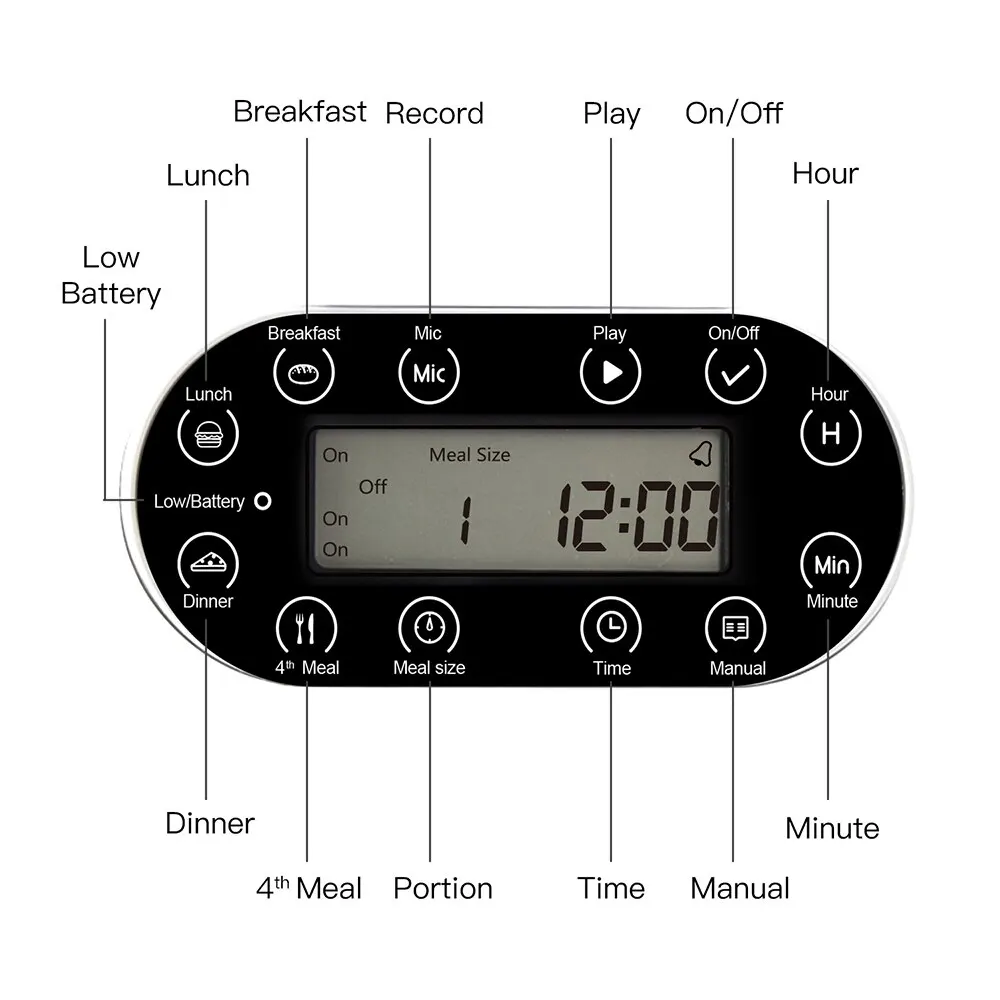 FeatureTime and portion programmable: You can feed your pet 4 meals at scheduled times, and everymeals have 1-20 portions control, which can help the pet develop a good eating habit.;
