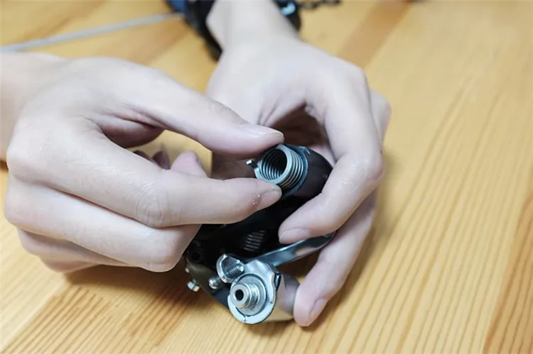 19. Клетка колеса шкива полностью вдавливается в задний переключатель. Подтвердите выравнивание основного болта.