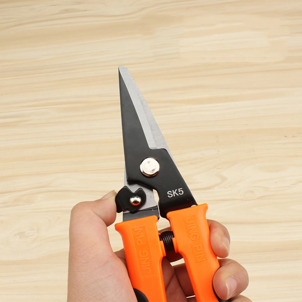 Особенности: Изготовлен из высококачественной стали SK5, закалка головки, высокая твердость, долговечность. Нескользящая ручка, удобная для захвата, легко режет металл. Рычаг блокировки, безопаснее, чтобы забрать лезвие. Идеально подходят для резки алюминия, винилового сайдинга, скрининга, картона, кожи и меди. Спецификация: Материал: SK5 сталь + ручка из ПВХ Цвет: оранжевый + черный Тип лезвия: прямой, изгиб Общая длина: 220 мм Длина ручки: 125 мм Ширина ручки: 59 мм Длина лезвия: 55 мм Посылка включает в себя: 1 ножницы