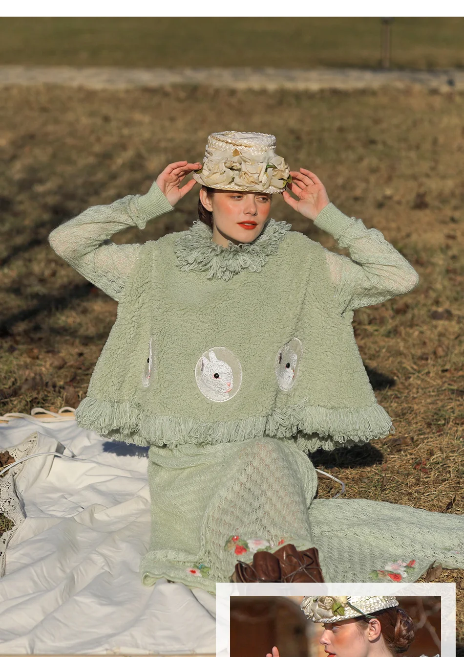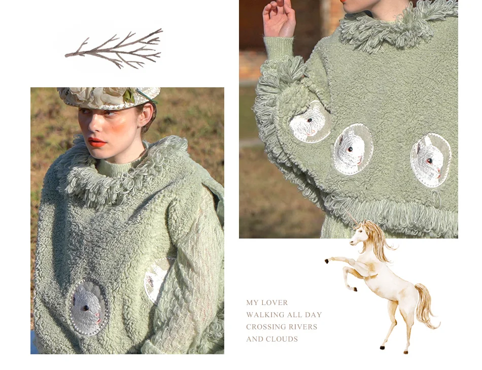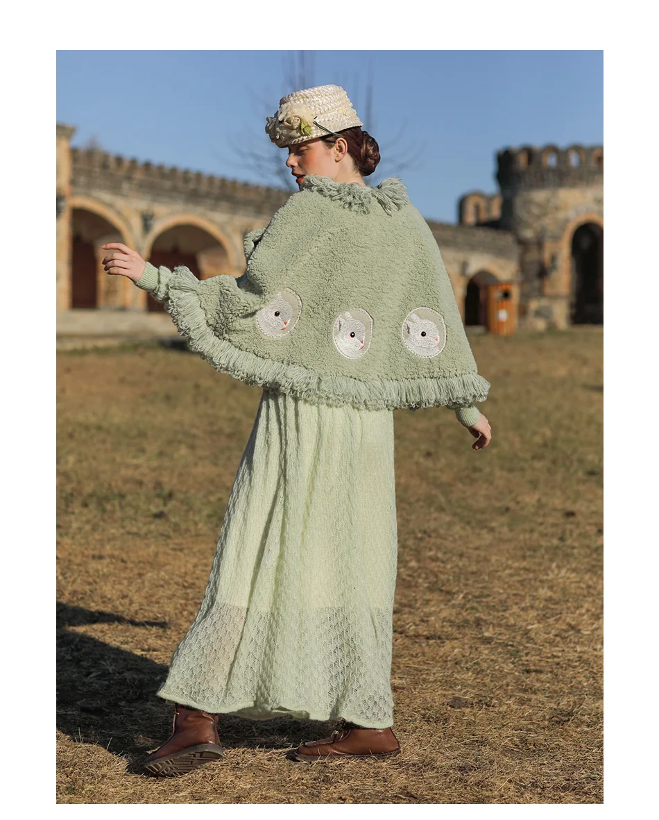 Винтажное милое короткое шерстяное пальто с милым кроликом и вышивкой, кисточки ручной работы, накидка с бисером.