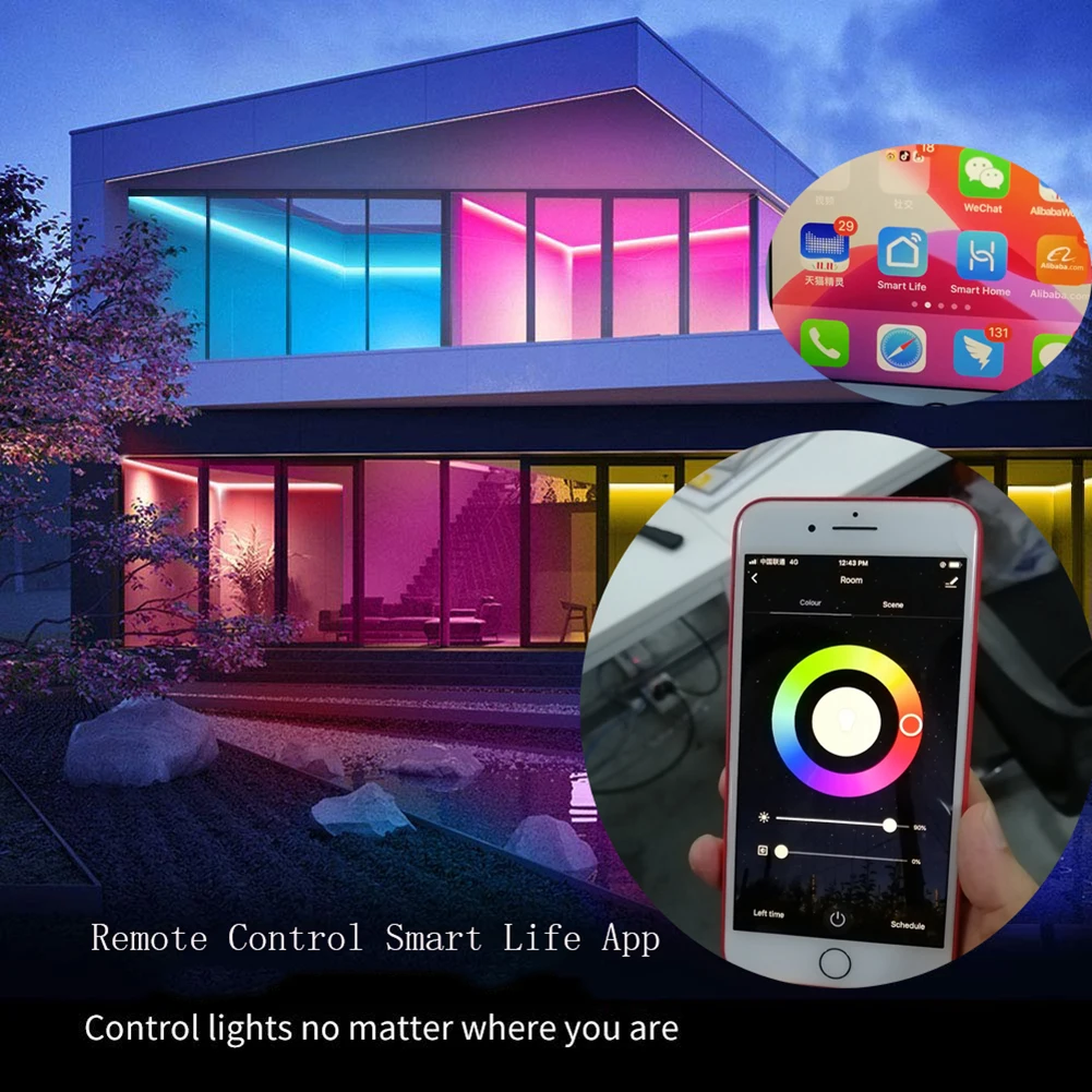 -Ступицы не требуются. Подключите светильник полосы к WiFi (только 2,4 ГГц), а затем вы можете включить/выключить светильник s, установите цвет или яркость через приложение Smart life на вашем телефоне в любое время и в любом месте.