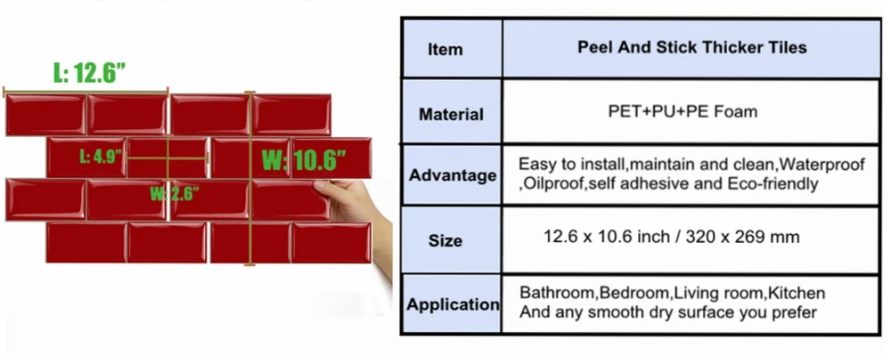 The peel and stick tiles can be worked on all smooth, clean, and dry surfaces, such as painted drywall or even right over ceramic tiles.Just peel and stick, easy to install it. All you need is a ruler, a pencil, a cloth and scissors. This project will save you lost of time and money compared with the real tile. And there is no worry the tile isn't fit the size of your wall as it is easy to cut.