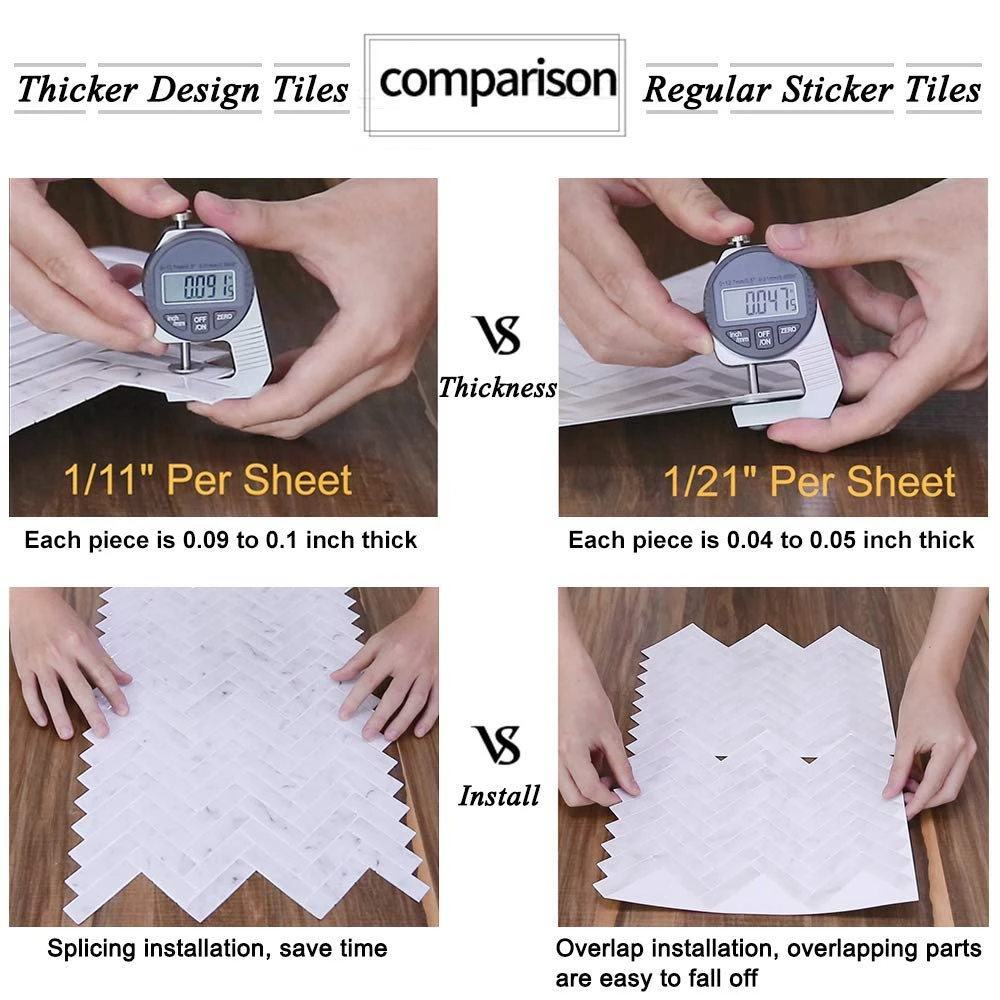 The tiles can be easily installed directly over existing panels or smooth surface. Especially designed for kitchen backsplash and bathroom backsplash, the tiles are resistant to the heat of stove tops and the humidity of bathrooms.