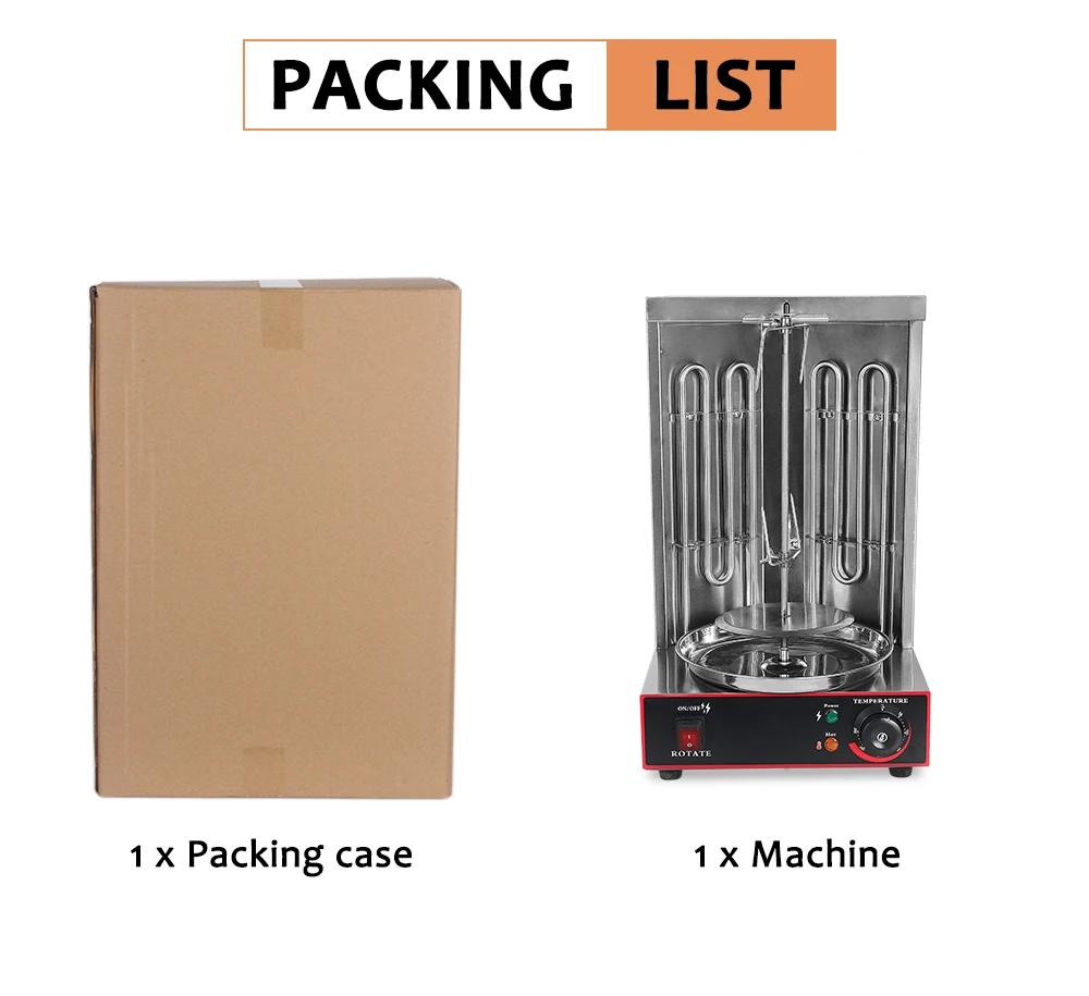 Описание: Цвет: серебристый Материал: нержавеющая сталь Горелка: две нагревательные трубы Диапазон температур: 50-300 ℃ Скорость вращения: 6 об/мин Тип топлива: электрический Размер машины: 29,5*26,5*48,5 см Размер посылка: 36,5*36*53 N.W. : 8 кг Характеристика 1. Нагревательная трубка: стабильное отопление, даже и высокая эффективность, клиентам не придется долго ждать 2. Вращающийся вал вращается автоматически, 6 оборотов в минуту, что делает барбекю равномерно нагреваться. 3. Индикатор питания и Индикатор нагрева для четкого отображения рабочего состояния 4. Регулируемая длина, подходит для фиксации различных размеров пищи 5. Мясная тарелка может быть разобрана и очищена, чтобы сохранить чистую и санитарную среду для приготовления пищи
