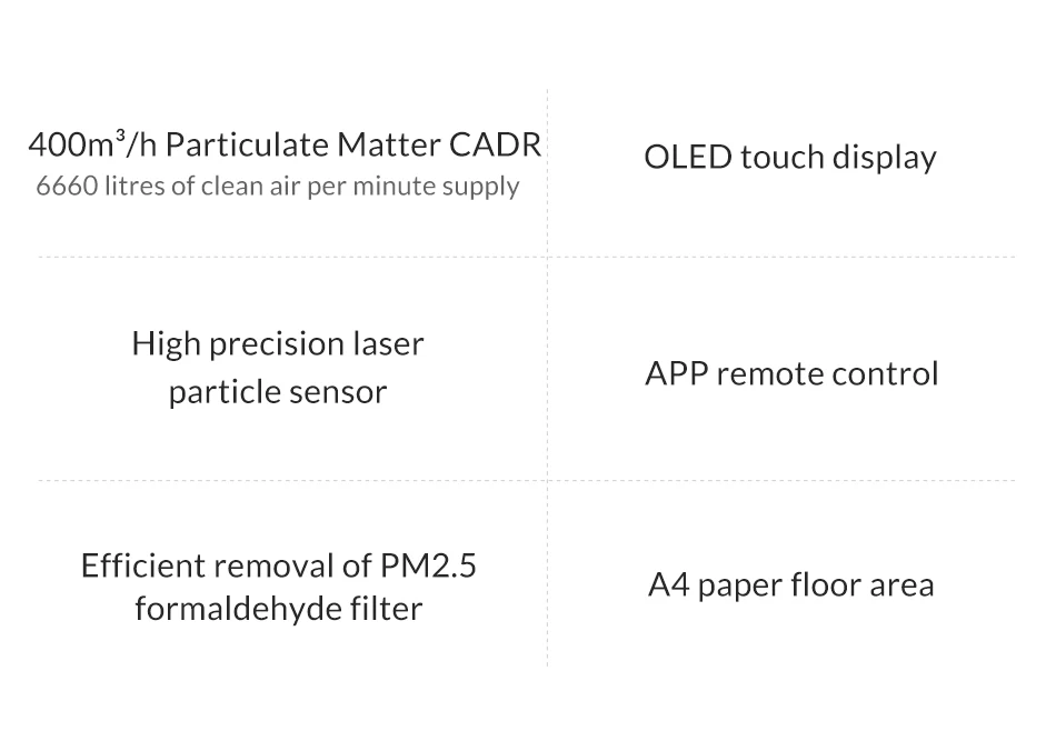Сенсорный дисплей OLEDВысокоточный лазерный датчик частиц/пульт дистанционного управленияЭффективное удаление формальдегида PM2.5/Площадь бумажного пола А4