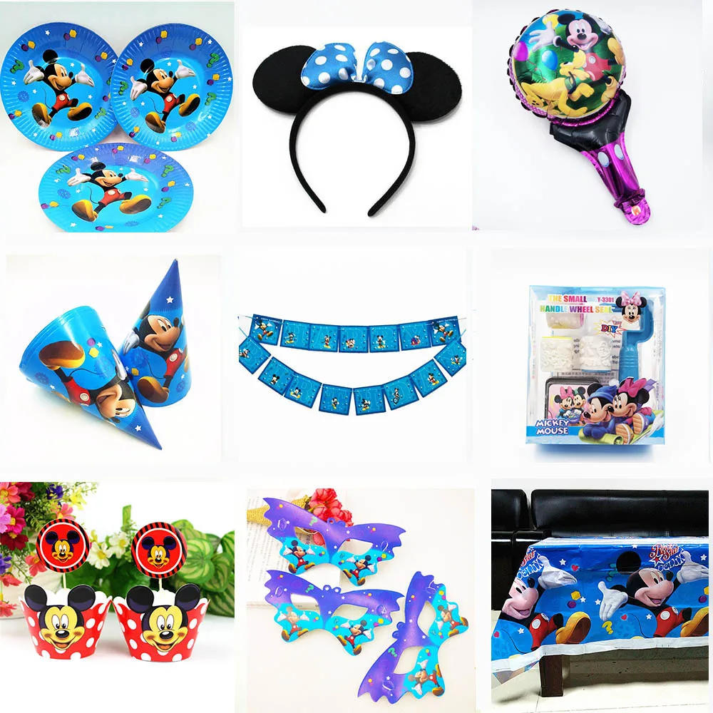 Вечерние принадлежности для Микки Мауса, украшения, скатерть, чашка, тарелка, соломенная салфетка, Подарочная сумка, свечи, конфета попкорн, коробка для детей на день рождения