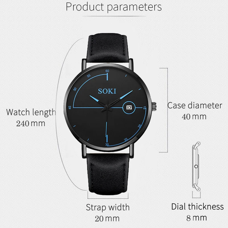 Диаметр циферблата: 40 мм Часовой механизм: кварцевый Материал корпуса: сплав Тип материала ремешка: кожаный ремешок Чехол Форма: круглый Чехол Толщина: 8 мм Стиль: Модный и повседневный Застежка Тип: Пряжка Длина ремешка: 24 дюйма Ширина ремешка: 20 мм Посылка: 1 * часы Часы weigt (g): приблизительно 45 Секундная стрелка-украшение В связи с разницей цветовой и световой настройки мониторов, фактический цвет может немного отличаться от цвета картинки. Замеры сделаны вручную, поэтому возможны отклонения на 0,5-1 см.