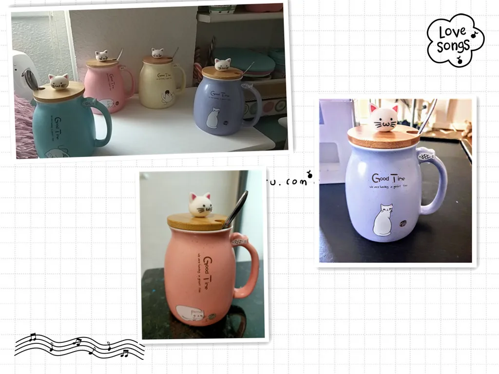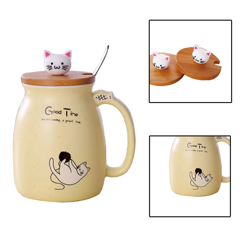 1. Креативный дизайн: Восхитительный рисунок кота, напечатанный на кружке, поставляется с милой и креативной деревянной губой. Яркая форма головы кошки, удобнее брать.