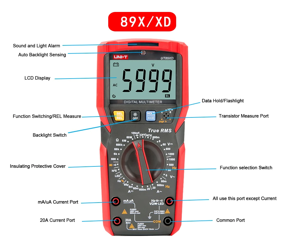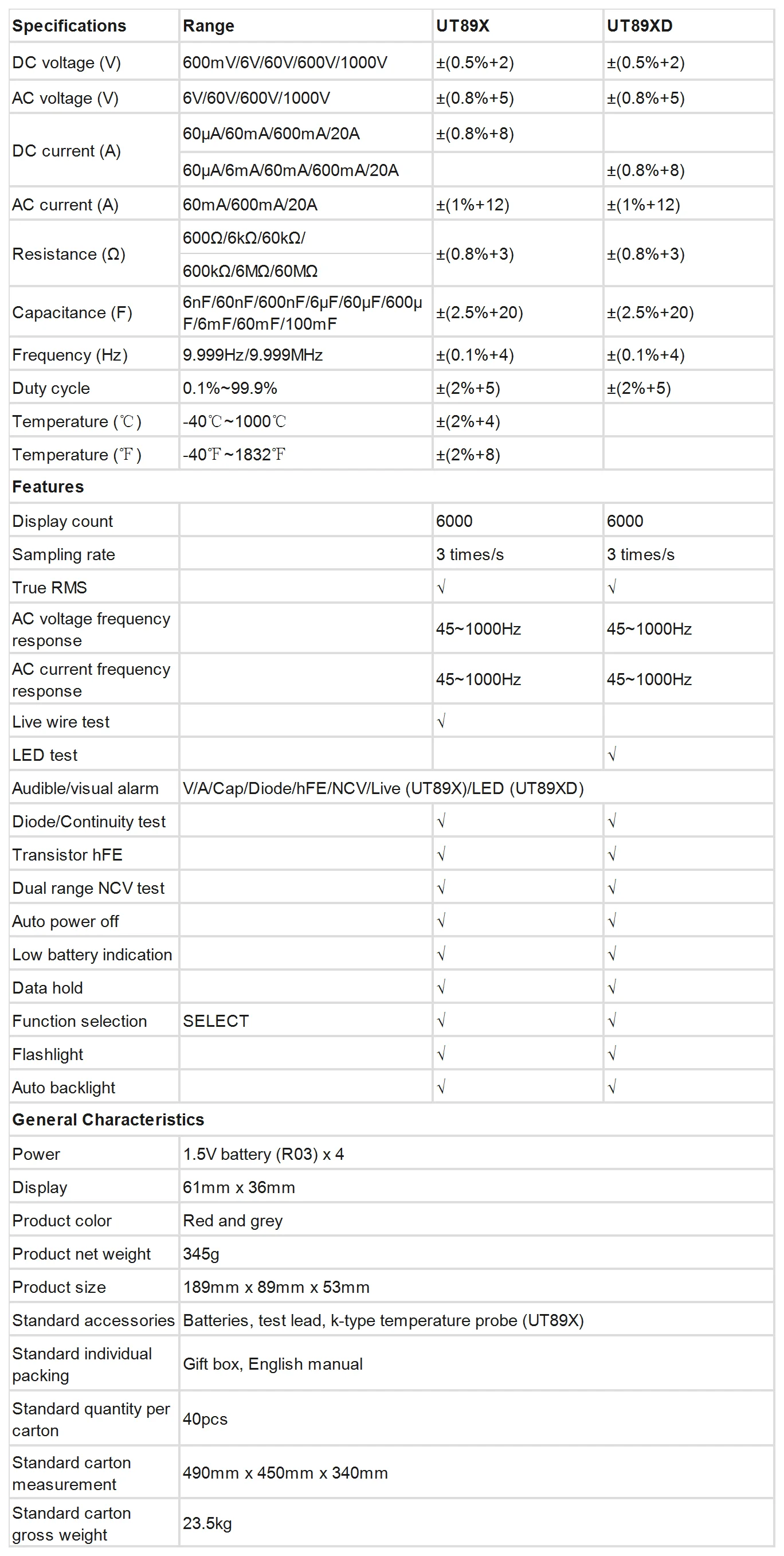 UT89X/UT89XD-это надежный Ручной цифровой мультиметр 35/6 бит с истинным измерением синусоидальной волны RMS. Он может измерить Макс. 1000 В постоянного/переменного напряжения, Макс. 20A DC/AC Ток, сопротивление, емкость, частота, диод, hFE, непрерывность и NCV, быстрое различие между нейтральными и живыми проводами точно. UT89X может измерять температуру и обнаруживать нейтральные и живые провода с тестовым руководством. UT89XD может выполнить светодиодный тест. Он привлекает пользователей своим двухцветный прочный Чехол, современный внешний вид и множество функций. Особенности: 1. 1000 В AC/DC; 20A AC/DC 2. Истинный RMS, 6000 граф 3. Двухдиапазонный NCV тест, который быстро определяет нейтральный и живой провод через светильник интенсивности 4. Светодиодный индикатор измерения (UT89XD) 5. Звуковая/визуальная сигнализация 6. Индикатор зарядки конденсатора 7. Эргономичный дизайн 8. Двойное литье под давлением 9. 1 м защита от падения 10. Фонарик; Автоматическая подсветка Обратите внимание: батарея в комплект не входит