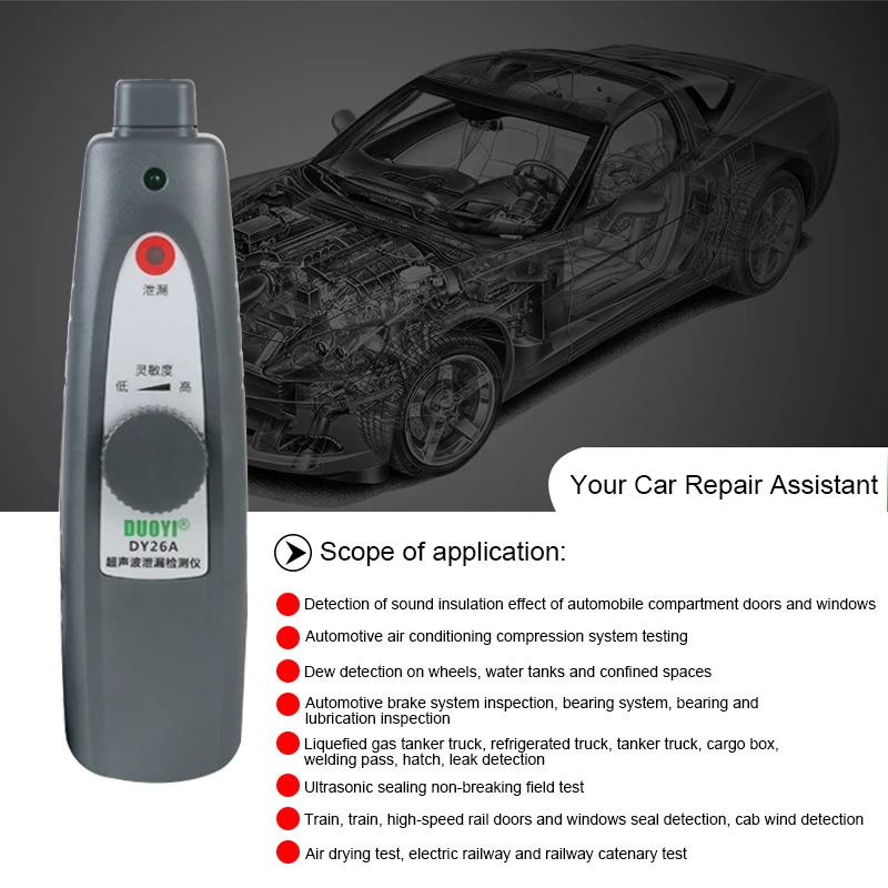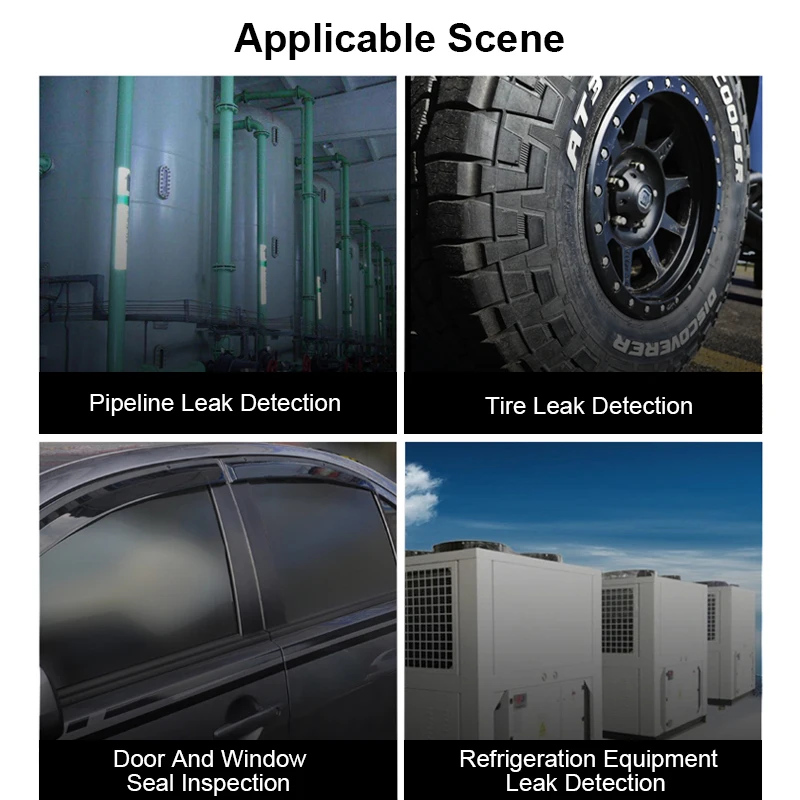 1. Тестирование системы сжатия кондиционера автомобиля. 2. Колесо, резервуар для воды, герметичное обнаружение утечки пространства. 3. Обнаружение автомобильной тормозной системы. Испытание подшипниковой системы, подшипника и смазки. 4. Грузовик-цистерна для сжиженного газа, рефрижератор, грузовик-цистерна, грузовой ящик, сварочный пропуск, дверь, обнаружение утечки. 5. Ультразвуковое запечатывание не-Разрывное испытание. 6. Поезд, мото автомобиль, высокоскоростная железнодорожная дверь и окно уплотнения обнаружения, кабина обнаружения ветра. 7. Обнаружение шума ветра, элементарная железнодорожная контактная сеть обнаружения.
