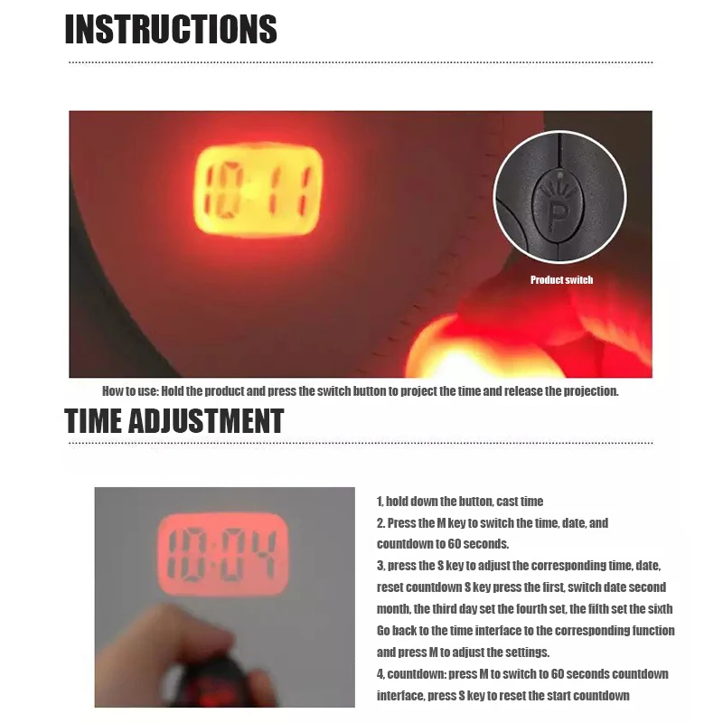 Проекционные часы для ключей нужны только для нажатия кнопки переключения, информация о времени и дате будет проецироваться на стене. В Видимость проецируемого изображения, очевидно, шрифт очень ясно, видимого диапазона-0,2-3 м, а также размер проекции-макс 300 см (длина) x 150 см (ширина), он имеет лучший эффект в ночное время.