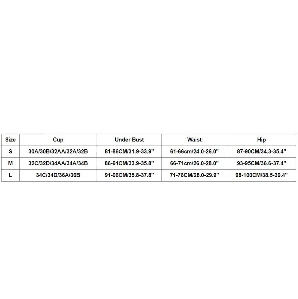 NOTE: Please compare the detail sizes with yours before you buy!!! Use similar clothing to compare with the sizeSize Cup Under Bust Waist Hip S 30A/30B/32AA/32A/32B 81-86CM/31.9-33.9" 61-66cm/24.0-26.0" 87-90CM/34.3-35.4" M 32C/32D/34AA/34A/34B 86-91CM/33.9-35.8" 66-71cm/26.0-28.0" 93-95CM/36.6-37.4" L 34C/34D/36A/36B 91-96CM/35.8-37.8" 71-76CM/28.0-29.9" 98-100CM/38.5-39.4"