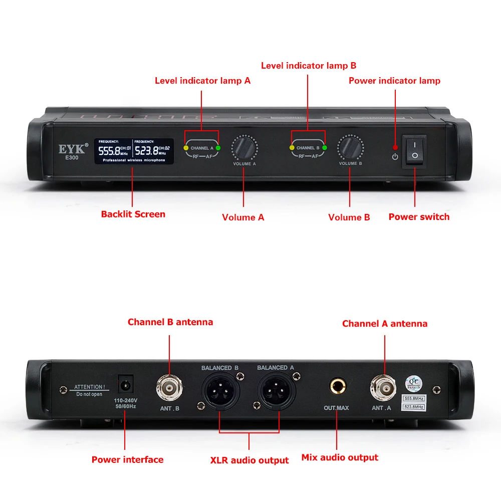 Частотный диапазон: УВЧ 523,8 МГц, 555,8 МГц (заказной 520-930 МГц) Режим колебания: фиксированная частота с кварцевым управлением Стабильность частоты: ± 0.005% Динамический диапазон: >110 дБ Максимальное отклонение частоты: ± 45 кГц Частотная характеристика: 60 Гц-18 кГц (± 3 дБ) S/N: >105 дБ T.H.D: ≦ 0.5% Рабочий диапазон: 50-80 метров (без препятствий)