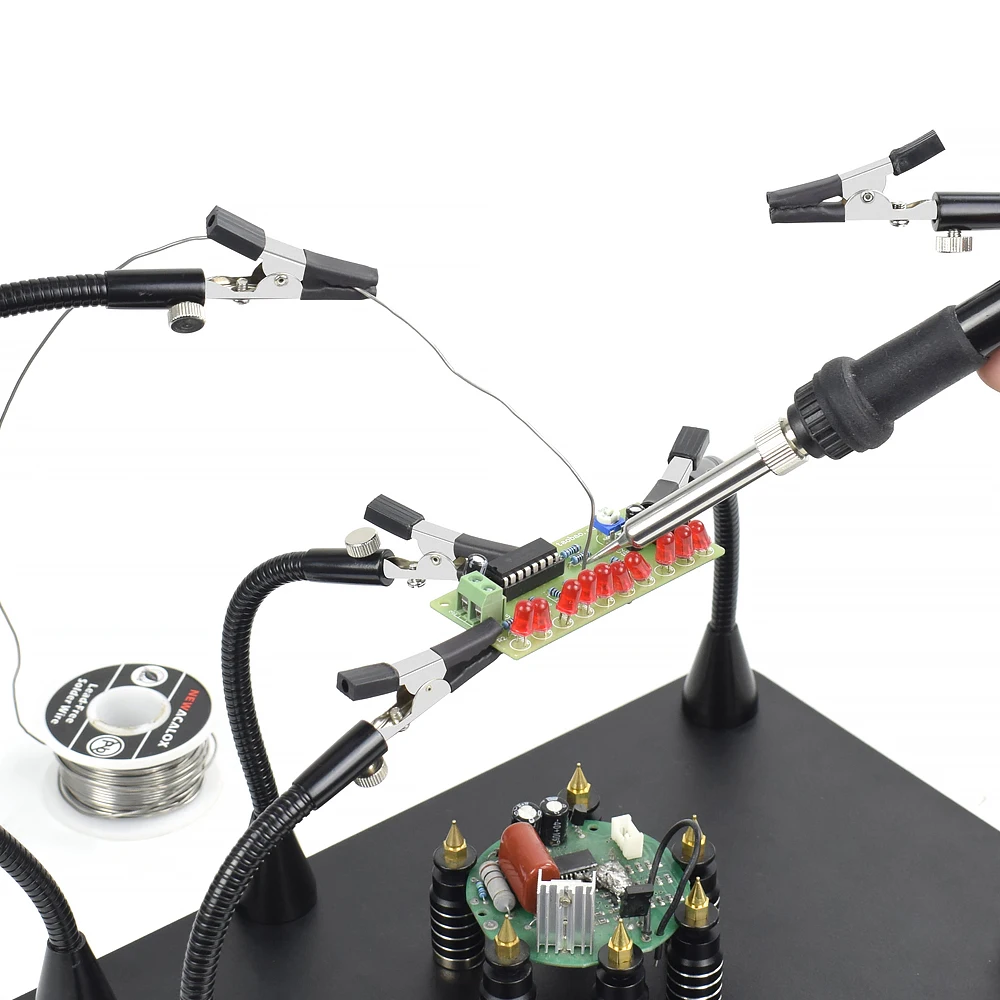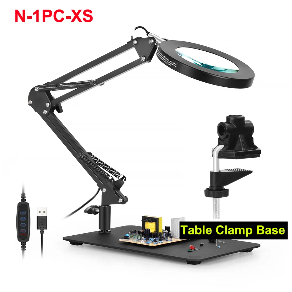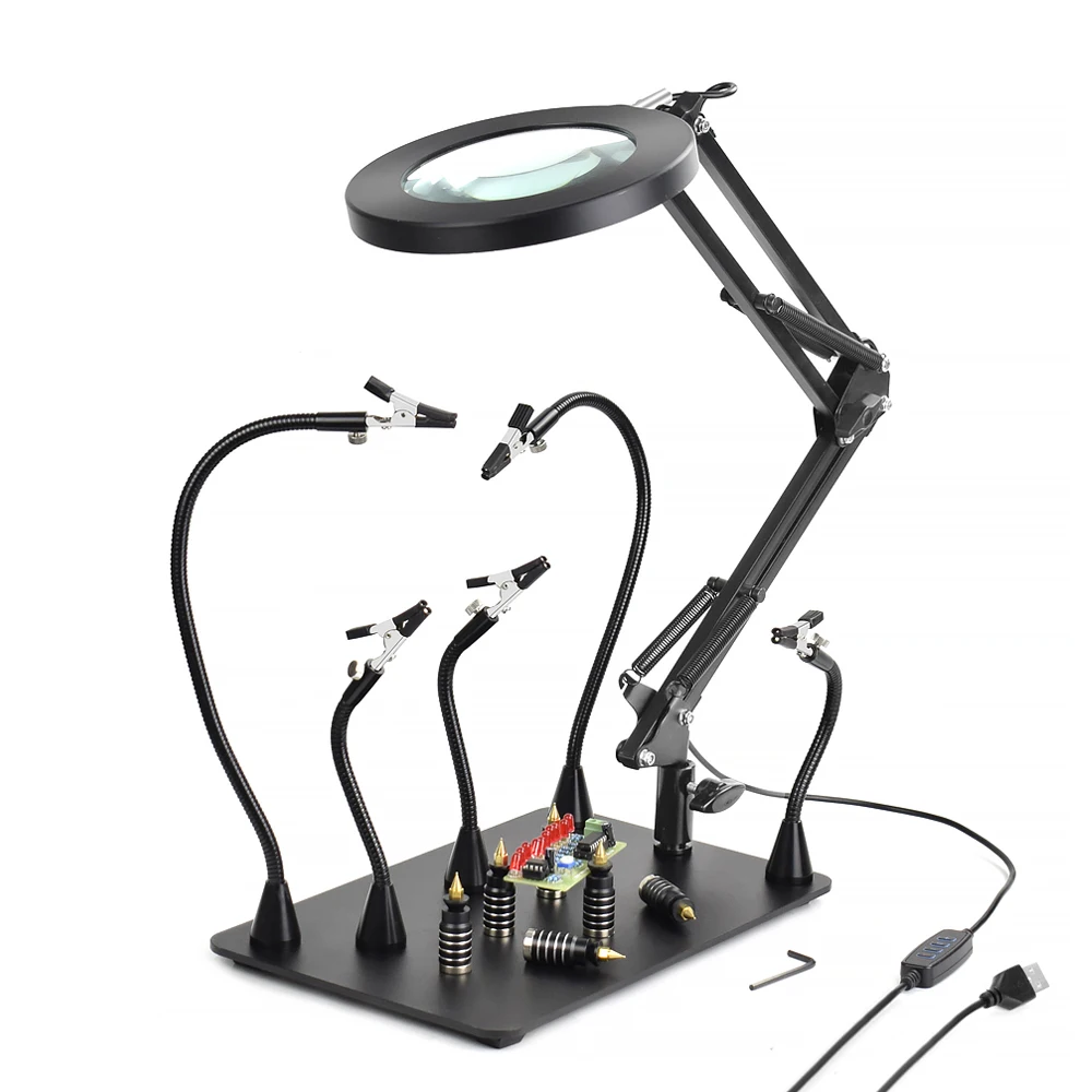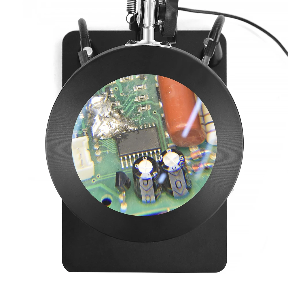 1. Головку лампы можно регулировать на 220 ° вверх и вниз и поворачивать на 360 °. 22 см + 22 см выдвижные длинные дужки, 180 °/135 ° можно регулировать.2. Увеличительное стекло светодиодный светильник кой, цветовую температуру светильник Ки можно регулировать в 3 шага, а яркость регулировать в 11 шагов, она может удовлетворить различные рабочие условия.3. Подходит для чтения работы/компьютерных плат/ювелирных изделий/художественных ремесел любителей/сварки переделки/ухода за кожей красоты4. Стальная основа-прочная стальная основа с порошковым покрытием, которая весит как раз, никогда не опрокидывается и удобна в переноске5. Четыре гибких рычага-каждая рука имеет прецизионный патрон типа Аллигатор на 360 градусов, который хватает за работу и освобождает руки. Для более эффективной работы.6. Идеально подходит для различных проектов-вы можете использовать его для выполнения различных работ своими руками, таких как хобби проекты, электроника, искусство и ремесла. Живопись статуй и моделей и т. д.Фиксированные зажимы для печатной платы 7,6 шт.-четыре магнитных фиксированных зажима можно перемещать по желанию, что является хорошим помощником для пайки печатных плат. Универсально.Посылка: