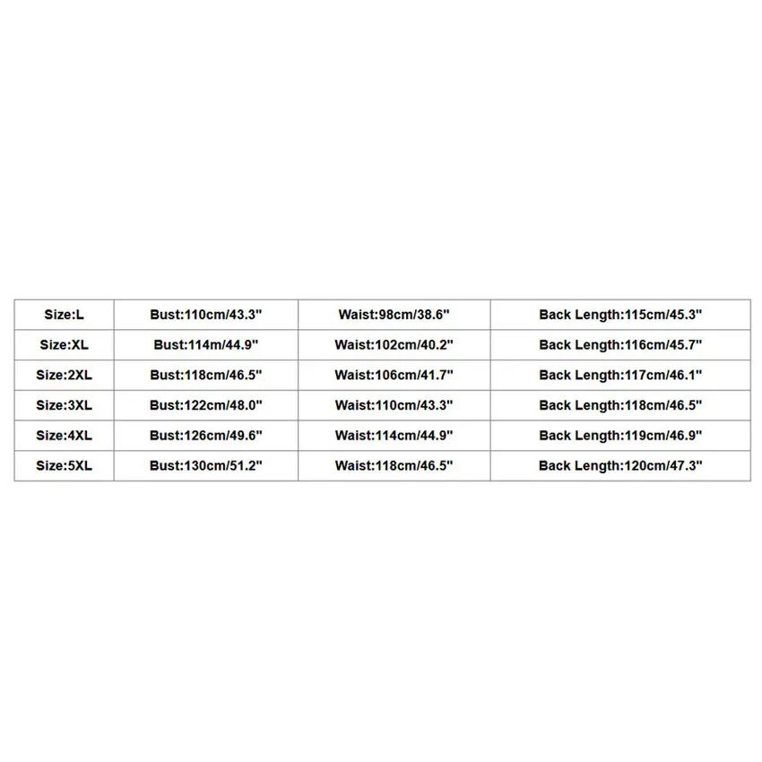 РазмерБюстТалияДлина спиныL110 см/43,3"98 см/38,6"115 см/45,3"XL114 м/44,9"102 см/40,2"116 см/45,7"2XL118 см/46,5"106 см/41,7"117 см/46,1"3XL122 см/48,0"110 см/43,3"118 см/46,5"4XL126 см/49,6"114 см/44,9"119 см/46,9"5XL130 см/51,2"118 см/46,5"120 см/47,3"Размер: LБюст: 110 см/43,3"Талия: 98 см/38,6"Длина спины: 115 см/45,3 дюймаРазмер: XLБюст: 114m/44,9"Талия: 102 см/40,2"Длина спины: 116 см/45,7 дюймаРазмер: 2XLБюст: 118 см/46,5"Талия: 106 см/41,7"Длина спины: 117 см/46,1 дюймаРазмер: 3XLБюст: 122 см/48,0"Талия: 110 см/43,3"Длина спины: 118 см/46,5 дюймаРазмер: 4XLБюст: 126 см/49,6"Талия: 114 см/44,9"Длина спины: 119 см/46,9 дюймаРазмер: 5XLБюст: 130 см/51,2"Талия: 118 см/46,5"Длина спины: 120 см/47,3 дюйма