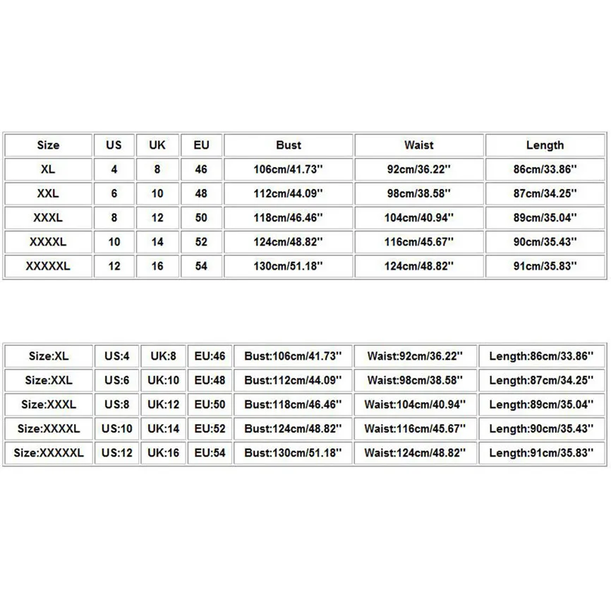 Что вы получаете: 1 шт. женское платьеРазмерСШАВеликобританияЕСБюстТалияДлинаXL4846106 см/41,73''92 см/36,22''86 см/33,86''XXL61048112 см/44,09''98 см/38,58''87 см/34,25''XXXL81250118 см/46,46''104 см/40,94''89 см/35,04''XXXXL101452124 см/48,82''116 см/45,67''90 см/35,43''XXXXXL121654130 см/51,18''124 см/48,82''91 см/35,83''