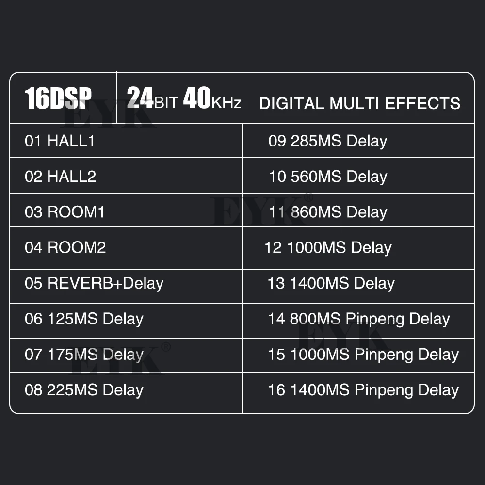 1. HALL1 2. HALL2 3. ROOM1 4. ROOM2 5. Задержка реверберации + 6. Задержка 125 мс 7. Задержка 175 мс 8. Задержка 225 мс 9. 285 мс задержка 10. 560 мс задержка 11. 860 мс задержка 12. Задержка 1000 мс 13. 1400 мс задержка 14. 800 мс задержка 15. Задержка в 1000 мс Pinpeng 16. 1400 мс задержка Pinpeng