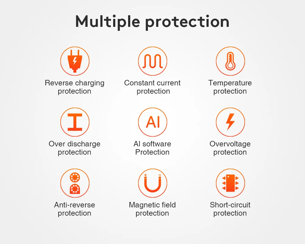 ★ защита от обратной полярности ★ защита от перенапряжения ★ защита от перегрузки по току ★ защита от короткого замыкания ★ защита от перезарядки ★ защита от перегрузки