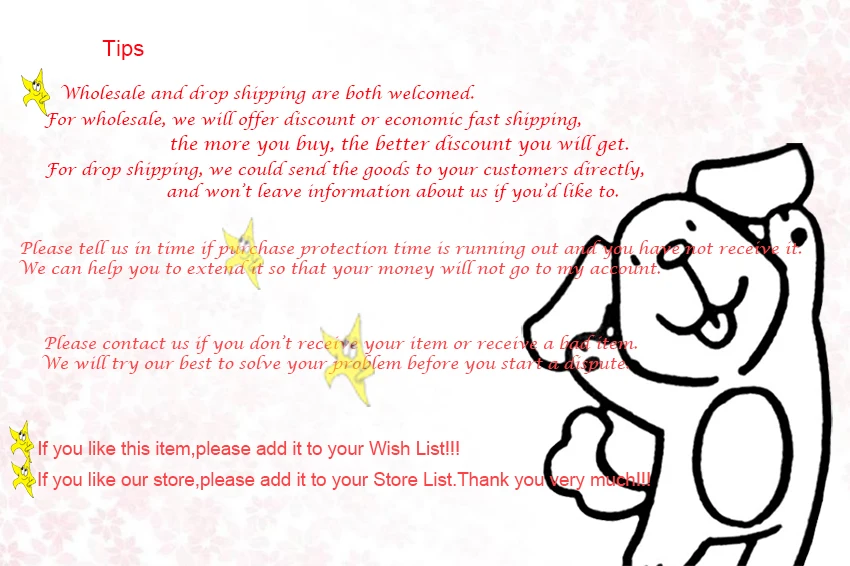 1. Заказы обрабатываются в течение 1-7 дней после оплаты и проверки. 2. Мы организуем доставку в соответствии с адресом покупателя, поэтому, пожалуйста, подтвердите и проверьте адрес, почтовый индекс и полное имя, которое вы заполнили на AliExpress. Адрес Вашего заказа должен совпадать с адресом доставки. (Для российских покупателей необходимо указать полное имя и полный адрес. Покупатели из Беларуси и Украины, предоставьте полное имя будет лучше для таможенного оформления.) 3. Если вы не получили ваш товар в течение 60 дней (Бразилия 90 дней), пожалуйста, свяжитесь с нами. Мы проверим его для вас. Когда вы получаете заказанные вами товары, в течение 24 часов, пожалуйста, проверьте его тщательно. Пожалуйста, свяжитесь с нами напрямую, если у вас есть какие-либо проблемы.