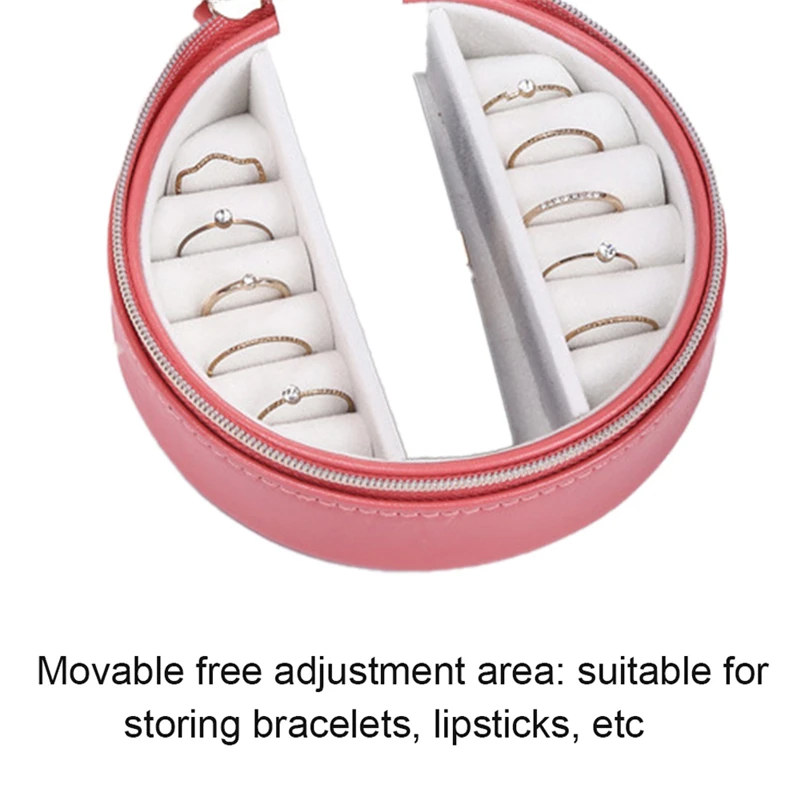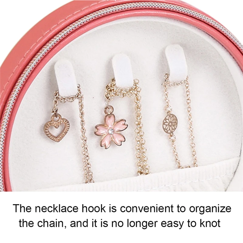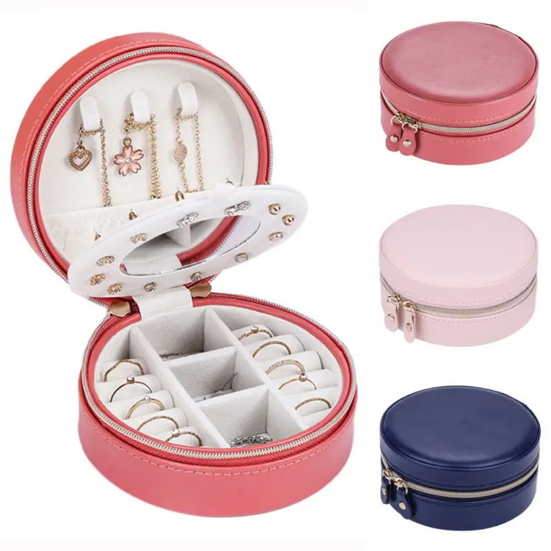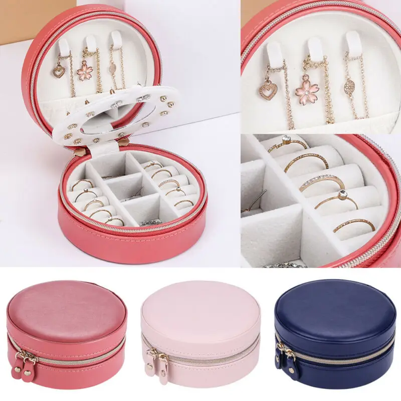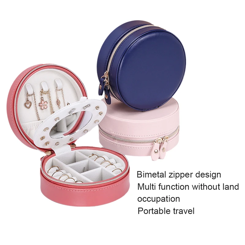 Портативная круглая шкатулка для украшений, органайзер для сережек из искусственной кожи на молнии, дорожные украшения, чехол для хранения с зеркалом