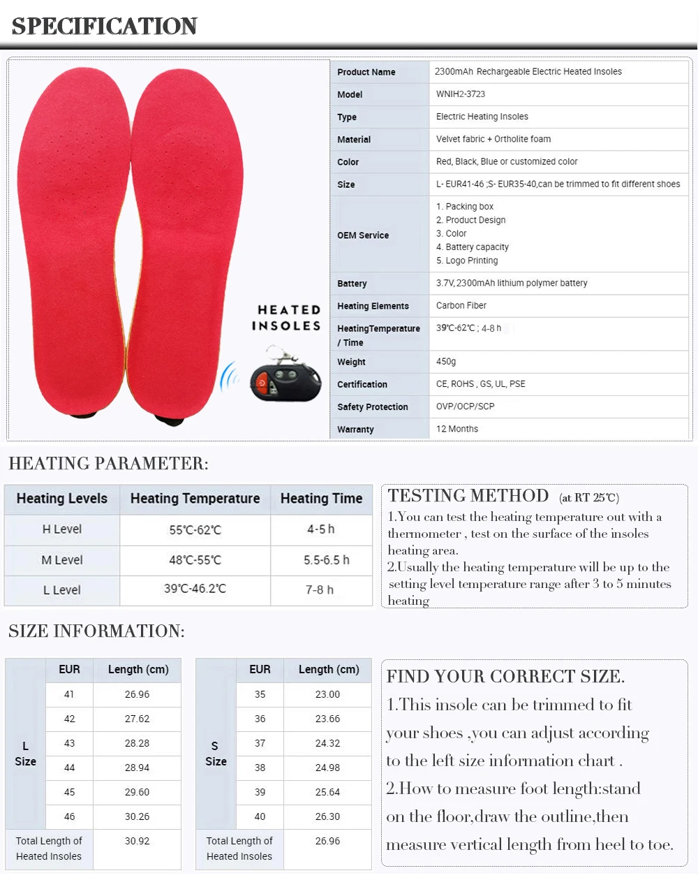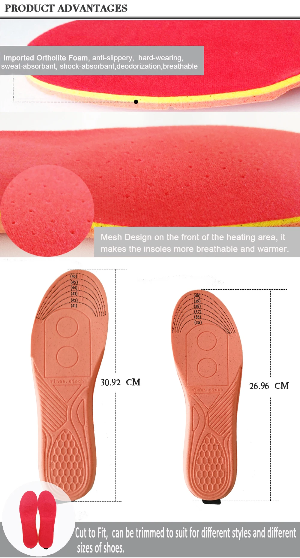 Безопасный и экологичный материал, дышащий, дезодорант, и тепловые стельки с подогревом, сохраняют тепло и тоска в холодную зиму и даже в сложную погоду;Высококачественный нагревательный элемент из углеродного волокна хорошо подходит для кровообращения человеческого тела, температура нагрева 39℃-62℃, и время работы около 4-8 часов;Крой: подходит для разных стилей и разных размеров мужской и женской обуви;CE, RoHS, GS, UL, PSE одобрены, наши электрические Подогреваемые стельки поставляются с гарантией 12 месяцев.