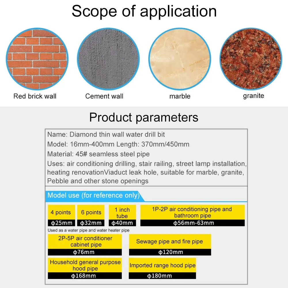 (Примечание: электрический молоток не может использоваться при длительной эксплуатации, электрический молоток не является профессиональным инструментом для сверления, электрический молоток может сверлить только кирпичную стену, не может добавить воды, поэтому нужно добавить воду самостоятельно, рекомендуется использовать алмазное ядро 63 мм или менее 63 мм)