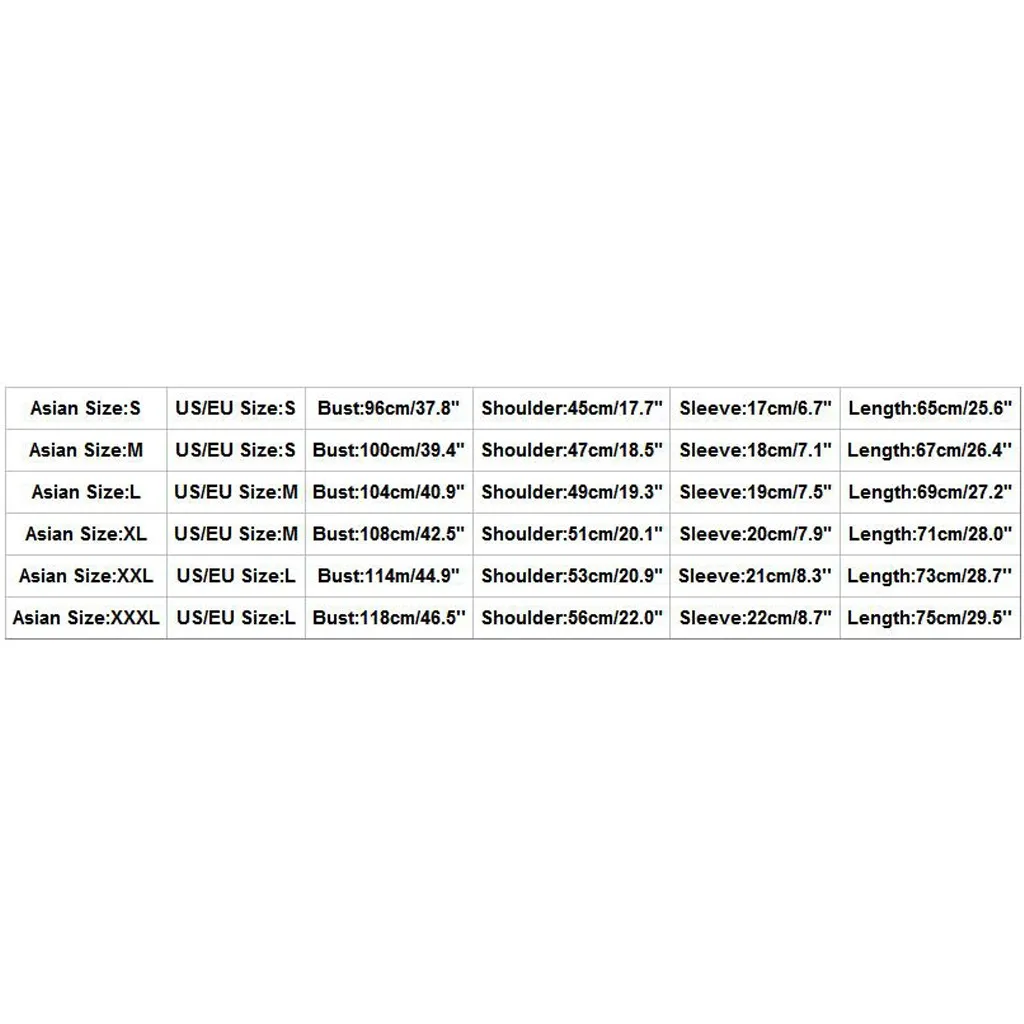 Азиатский размер Размер США/ЕС Бюст Плечо Рукав Длина S S 96 см/37,8" 45 см/17,7" 17 см/6,7" 65 см/25,6" М S 100 см/39,4" 47 см/18,5" 18 см/7,1" 67 см/26,4'' L М 104 см/40,9" 49 см/19,3" 19 см/7,5 дюйма 69 см/27,2" XL М 108 см/42,5" 51 см/20,1" 20 см/7,9 дюйма 71 см/28,0" XXL L 114 м/44,9" 53 см/20,9" 21 см/8,3'' 73 см/28,7'' XХХL L 118 см/46,5'' 56 см/22,0" 22 см/8,7" 75 см/29,5''