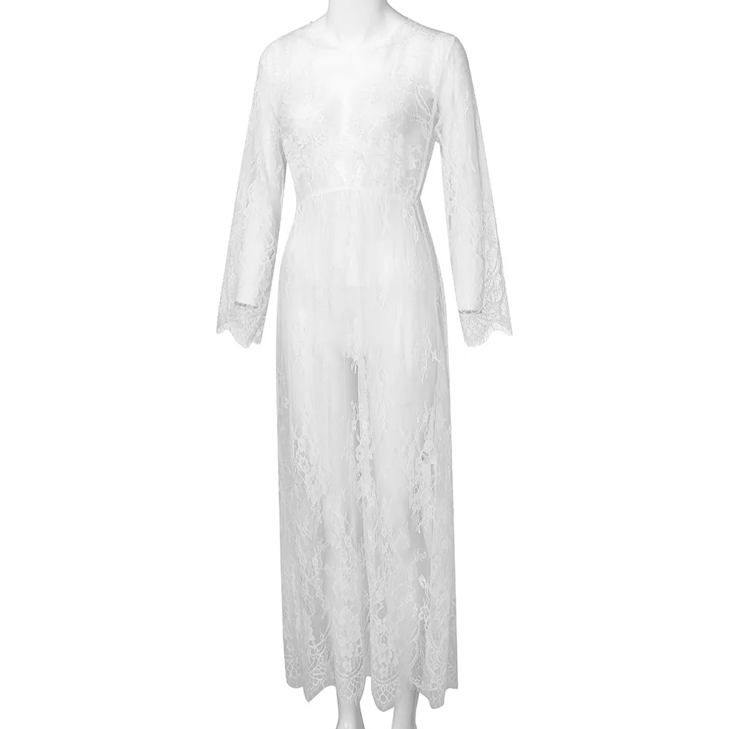 Womens Beach Swimsuit Bikini Cover up Dress Ladies Lace Mesh Long Dress Sexy Kaftan Summer Boho Maxi Dress White Bathing Suit