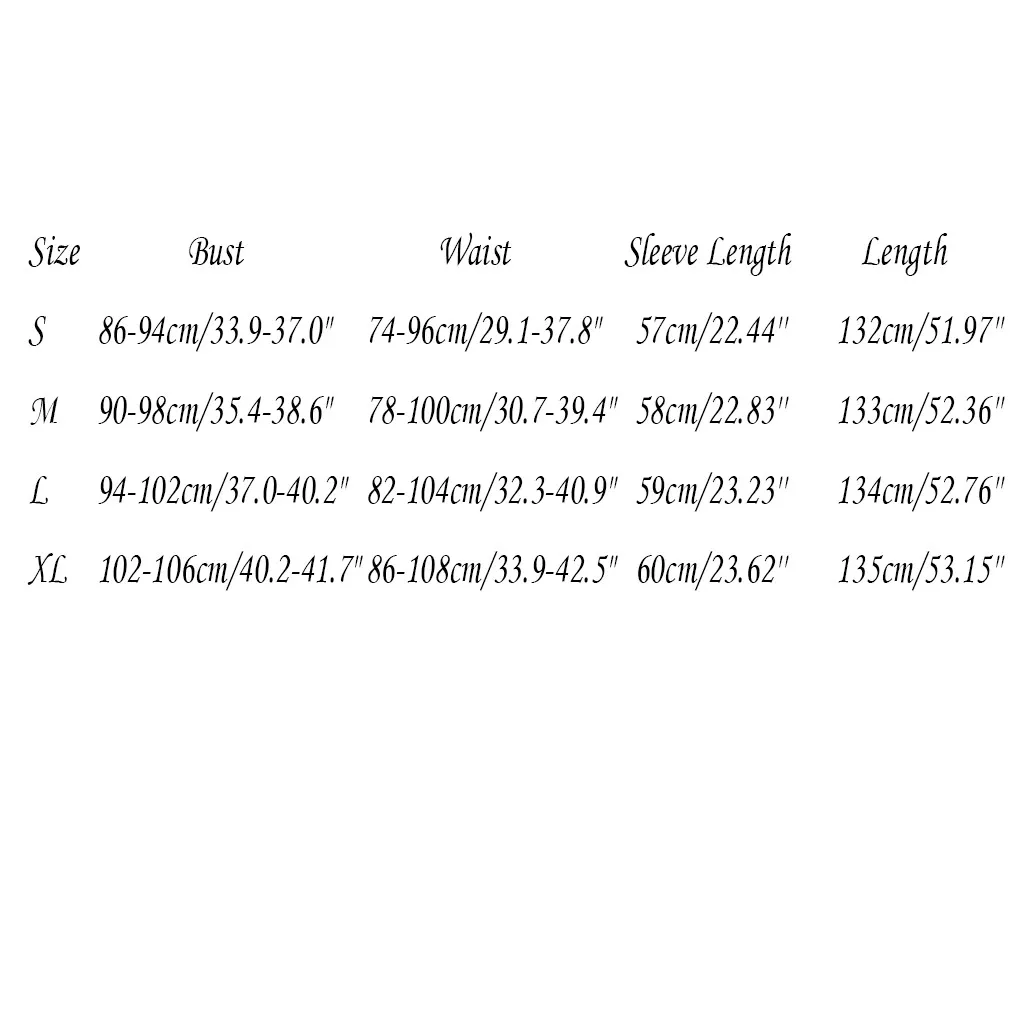 Size Bust Waist Sleeve Length Length S 86-94cm/33.9-37.0" 74-96cm/29.1-37.8" 57cm/22.44'' 132cm/51.97'' M 90-98cm/35.4-38.6" 78-100cm/30.7-39.4" 58cm/22.83'' 133cm/52.36'' L 94-102cm/37.0-40.2" 82-104cm/32.3-40.9" 59cm/23.23'' 134cm/52.76'' XL 102-106cm/40.2-41.7" 86-108cm/33.9-42.5" 60cm/23.62'' 135cm/53.15''