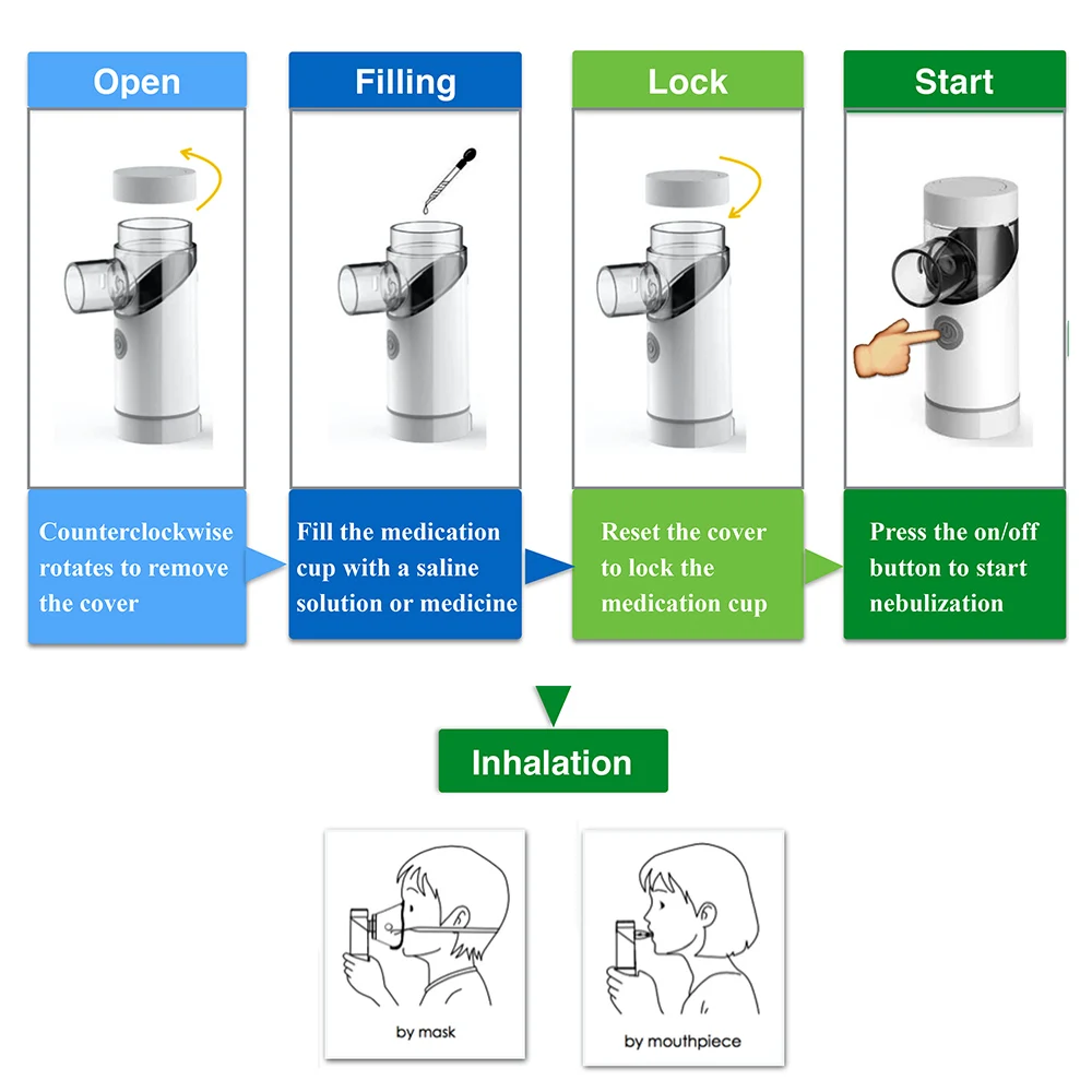 Название продукта: портативный сетчатый распылитель Технология: вибрирующий сетчатый Размер частиц (MMAD):1-5 мкм Остаточный объем: менее 0,1 мл Источник питания: литий-полимерный аккумулятор (встроенный) Мощность Потребляемая мощность: 3,5 W Вибрационная частота: 130 кГц Емкость лекарств: 8 мл Распыление скорость передачи данных: ≥ 0,35 мл/мин. Размер: 55 (Ш) * 39 (Д) * 100 (В) мм Устройство weigth:93G, включая батарею Особенности: 1. Микро-пористая прямая технология распыления, размер капель: 0,5-5 микрон, подходит для детей и взрослых. 2. Этот мини-ингалятор Размер измеряет на 4 (Д) * 1,6 (Ш) дюймов, более удобно носить с собой в сумке для хранения и кармане. 3. Ультра-тихий, низкое энергопотребление, этот сетчатый ингалятор встроен в литиевую батарею емкостью 1400 мА · ч и может заряжаться через прилагаемый usb-кабель. Полная зарядка может длиться один день или больше. 4. Режимы работы: автоматически отключается, цикл 10 минут. Примечание: для непрерывной работы необходимо нажать кнопку ВКЛ/ВЫКЛ вручную. Эксплуатация 1). Добавьте жидкость в стаканчик для лекарств 2). Откройте стаканчик для лекарств с вращением против часовой стрелки, чтобы удалить комбинезон. 2) стаканчик для лекарств с солевым раствором или лекарством (S8ml). Примечание: Если рекомендуемая доза лекарственного средства меньше, чем 2 мл, Снимите это количество не менее 4 мл с помощью только изотонического солевого раствора. Вязкие лекарственные средства также могут потребовать разбавления. Всегда следуйте инструкциям вашего врача. 3). Закройте стаканчик для лекарств. Примечание 1. Никогда не держите все устройство или Основное устройство для очистки под проточной водой. 2. Убедитесь, что вы не прикасайтесь к сетке, так как это может разрушить ее. Сетка не может быть промыта под прямой проточной водой, в противном случае сетка может быть повреждена. 3. Если какие-либо следы медицинских растворов или примесей остаются на устройстве и небулайзер использует ватные палочки для их удаления. 4. Очистите снаружи сетки и снаружи стакана для лекарств с помощью ватного бутона или мягкой чистой бумаги.