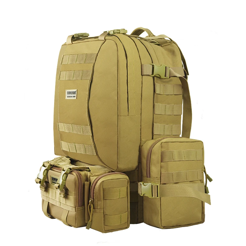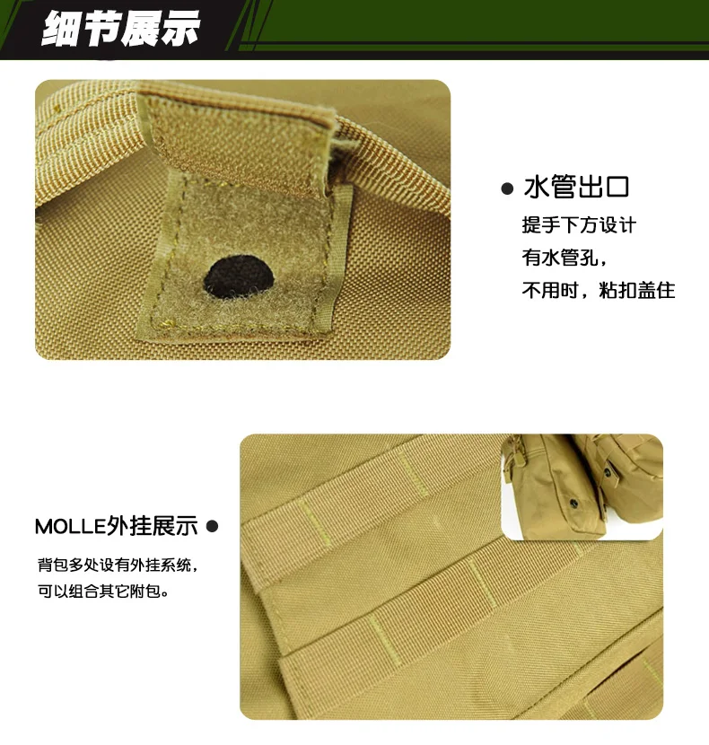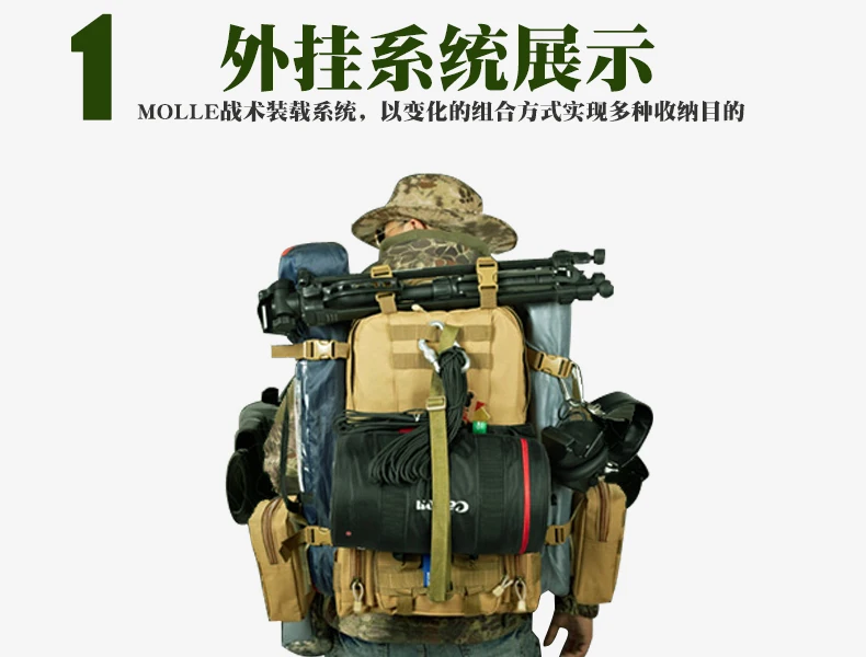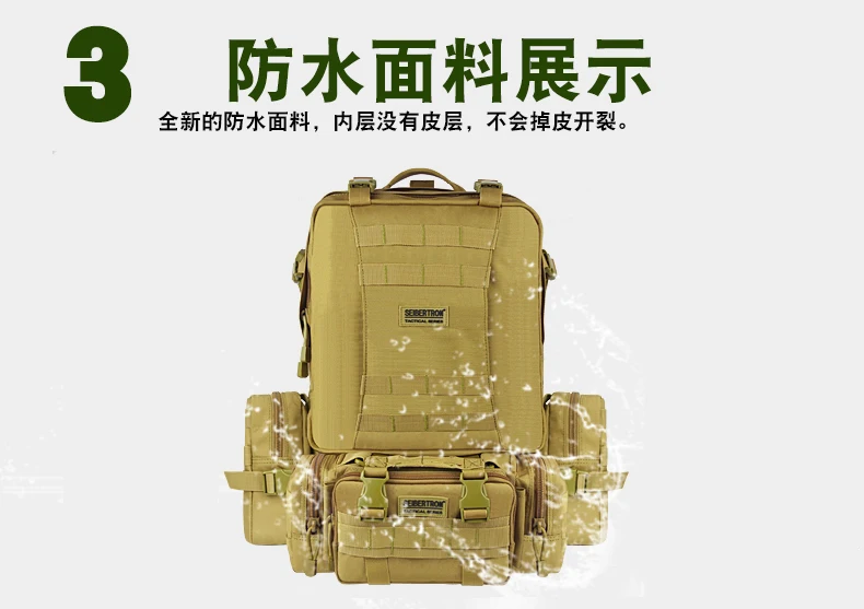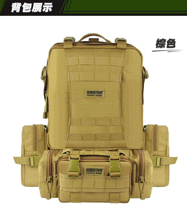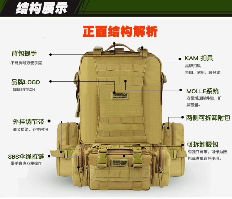 Заказ включает в себя: 1 шт. Тактическая Военная Сумка для альпинизма походная комбинированная сумка, задняя упаковка Вложения: 1 шт. основной пакет + 1 шт. передний чехол + 2 шт. боковые сумки Цвет: черный, хаки Материал: полиэстер Вес нетто: 2,5 кг Основной пакет: 50 см x 30 см (не включая насадки) Передняя Упаковка: 33 см x 15 см x 13 см Передняя сумка (Нижняя передняя): 33 см x 15 см x 9 см Прикрепляемый боковой мешочек (каждый): 22 см x 14 см x 8 см 1. 1in molle лямки по всему рюкзаку 2. Регулируемые лямки для плеч, груди и талии 3. Ремень и зажим вокруг рюкзака, можно добавить на Сумки и аксессуары, как раз обо всем. 4. Съемные боковые и передние сумки могут использоваться отдельно. 5. Выдерживает суровые боевые ситуации. 6. Выглядит классно, идеально подходит для активного отдыха, как охота, туризм и т. Д.