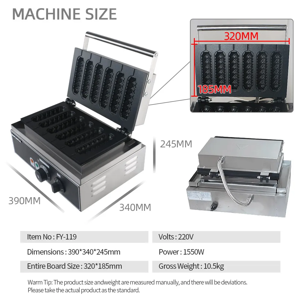 1. Мощность: 1550 Вт 2. Напряжение: 110-130 в/220-240 В 3. Материал: нержавеющая сталь 4. Размер машины: 390*340*245 мм 5. Размер упаковки: 435*340*305 мм 6. Диаметр Вафли: 140*40 7. Форма: 6 отверстий 8. Диапазон температуры: 0 ~ 300 градусов Цельсия 9. Таймер: 0-5Mintues
