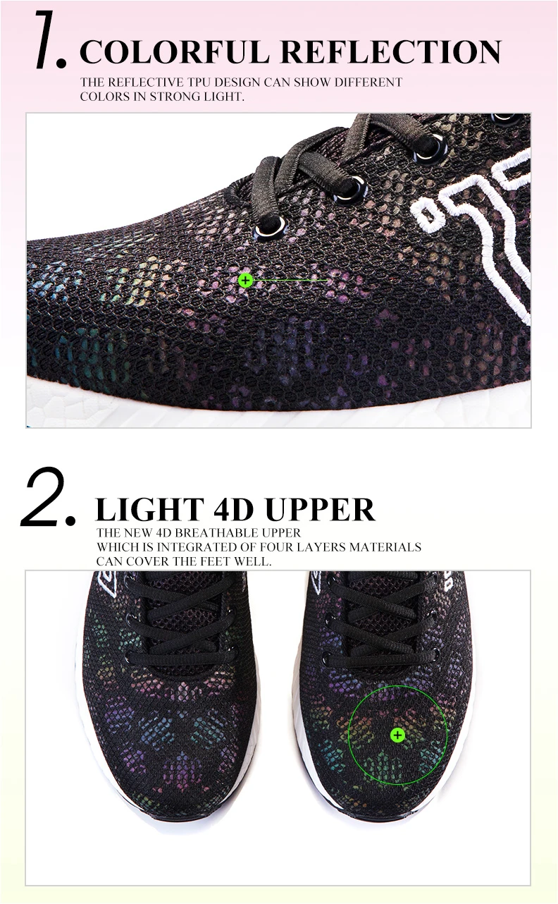 1. Красочное отражение (Отражающий дизайн из ТПУ показывает, что сильный светильник имеет различные цвета) 2. Светильник 4D верх (Новая дышащая верхняя часть 4D, которая интегрирована из четырех слойных материалов, может хорошо покрыть ступню)
