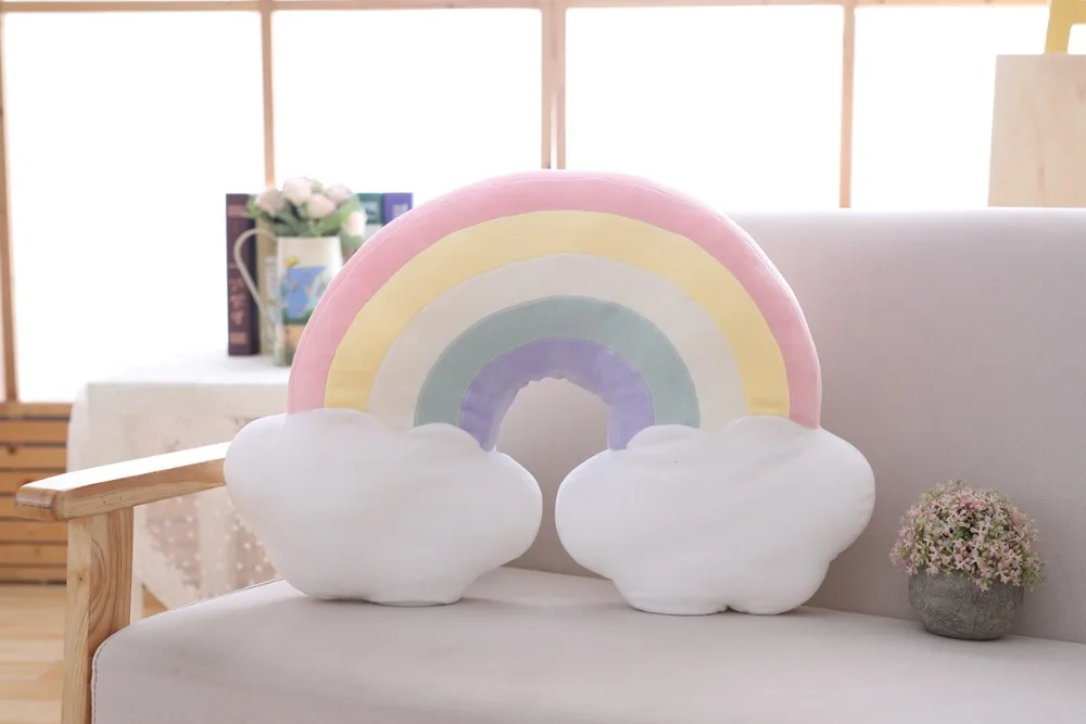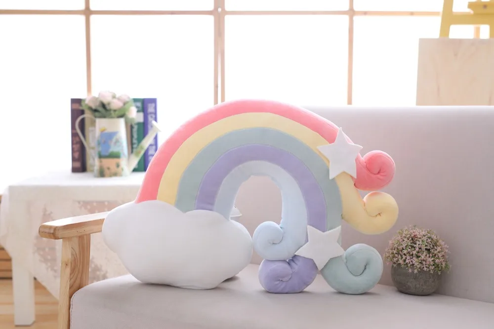 Плюшевая подушка с изображением радуги облака Звезды Луны Размер: Радуга-50x38 см облако-53x40 см Метеор-55x30 см Оболочка -- 45x35 см звезда -- 36x36 см Луна -- 45x20 см Высота -- 30x20 см шар -- 35x35см