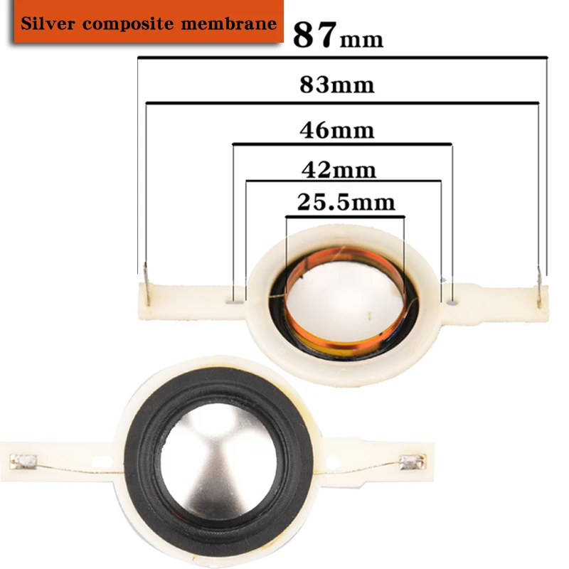 Maximum power: 30W Impedance: 8 ohms Dc resistance approx. 5~6.5 ohms Inner diameter of voice coil :25.5mm. Total lenght: silver 87mm(Black 80mm) Distance between the two terminals :Silver 83mm(Black 77mm), Fixed voice coil screw hole :46mm, Plastic support diameter:42mm Diameter of screw hole: about 3mm; Bracket thickness :2mm, Overall height of voice coil components: 11mm, Net weight approx. 2.5g/ piece.