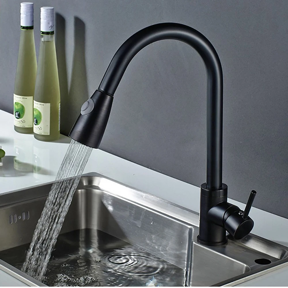 With a short single rod, a rotatable long spout and a flexible pull-out head, the water jet can be adjusted by pressing a button