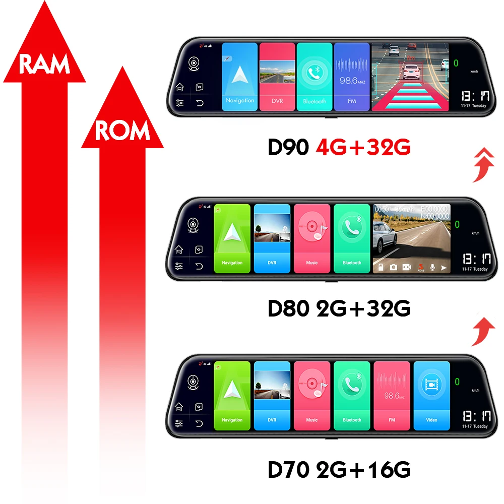 > D40: нормальное Зеркало dvr > D70: 2G RAM + 16G ROM > D80: 2G RAM + 32G ROM/24H монитор парковки > D90: 4G RAM + 32G ROM/24H монитор парковки