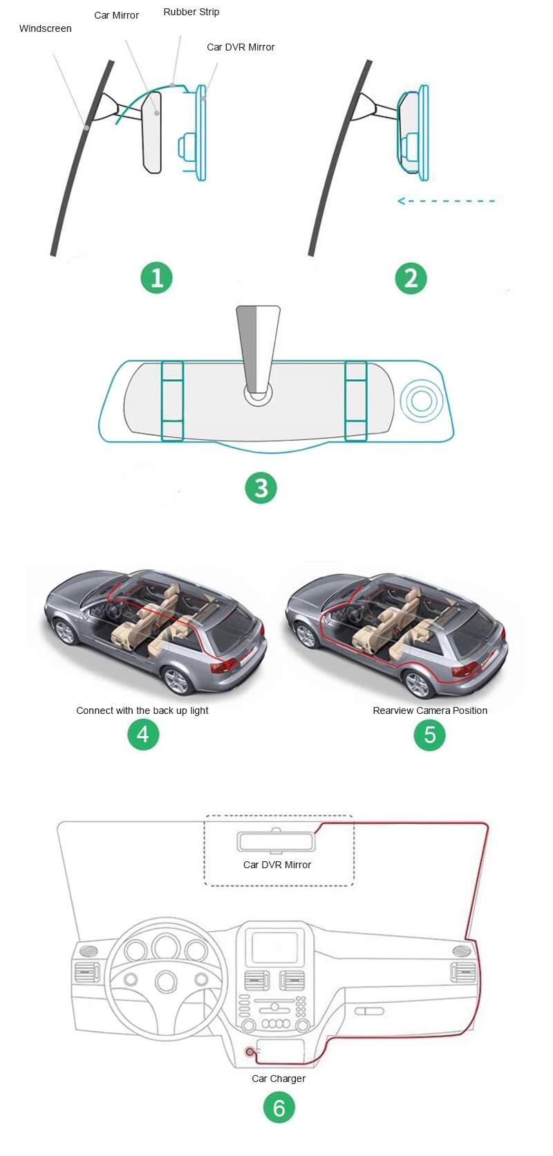 Зарядное устройство в прикуриватель для питания автомобильного видеорегистратора. Когда вы получите свой автомобиль в обратном направлении, Автомобильный видеорегистратор автоматически переключается на заднюю камеру с помощью линии парковки. Тогда функция автоматического заднего хода будет работать
