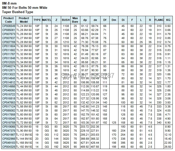 Каталог для 8 м для ремней шириной 50 мм С коническим отверстием производства Bushed Тип
