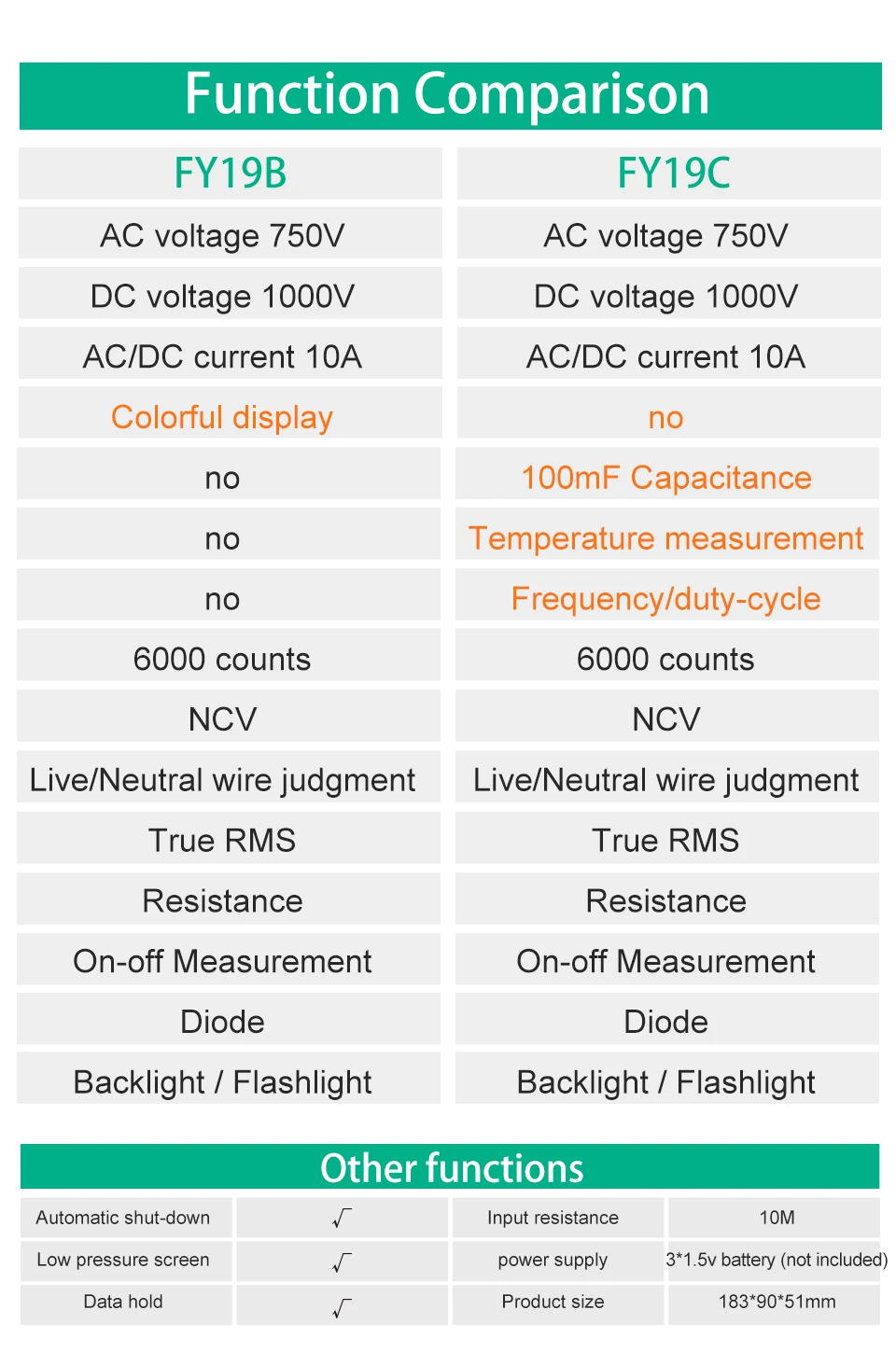Максимальная Дисплей 6000Диапазон Управление Ручной диапазонDC Напряжение 600 мВ/6В/60В/600V/1000V AC Напряжение 6V/60V/600V/750V (FY19B 50Hz-60Hz) (FY19C 50Hz-1000Hz) Сопротивление 600Ω/6K Ω/60K Ω/600K Ω/6M Ω/20MΩ(FY19B)/60Mou(FY19C)Постоянный ток 600mA(FY19B)/60ма/600мa/10A Переменного тока 600mA(FY19B)/60mA/600mA/10A (FY19B 50Hz-60Hz) (FY19C 50Hz-1000Hz) Постоянной ёмкости, универсальный конденсатор (FY19C) 6nF/60nf/600nf/6 мкФ/60 мкФ/600 мкФ/6mF/99.99mF Частота (FY19C) 9,999 Гц/99,99 Гц/999,9 Гц/9,999 кГц/99,99 кГц/999,9 кГц/9,999 МГцРабочий цикл1% ~ 99%Температура(FY19C) -20 ℃ ~ 1000 ℃ / -4 ℉ ~-1832 ℉ Рабочий цикл 10% ~ 95% Диод Тесты Да Непрерывный звуковой сигнал ДаБесконтактная проверка напряжения переменногоДа Авто Мощность Off Доставка производится в течение 15 минут Мощность питания 1,5 V * 3AAA батарея (не входит в комплект)Безопасность уровняIEC61010-1 кошка пижамы для малыша IIIОперационной Температура температуры и влажности 0 ~ 40 ℃ / 32 ~ 104 ℉, 45% -80% RHДля хранения Температура температуры и влажности