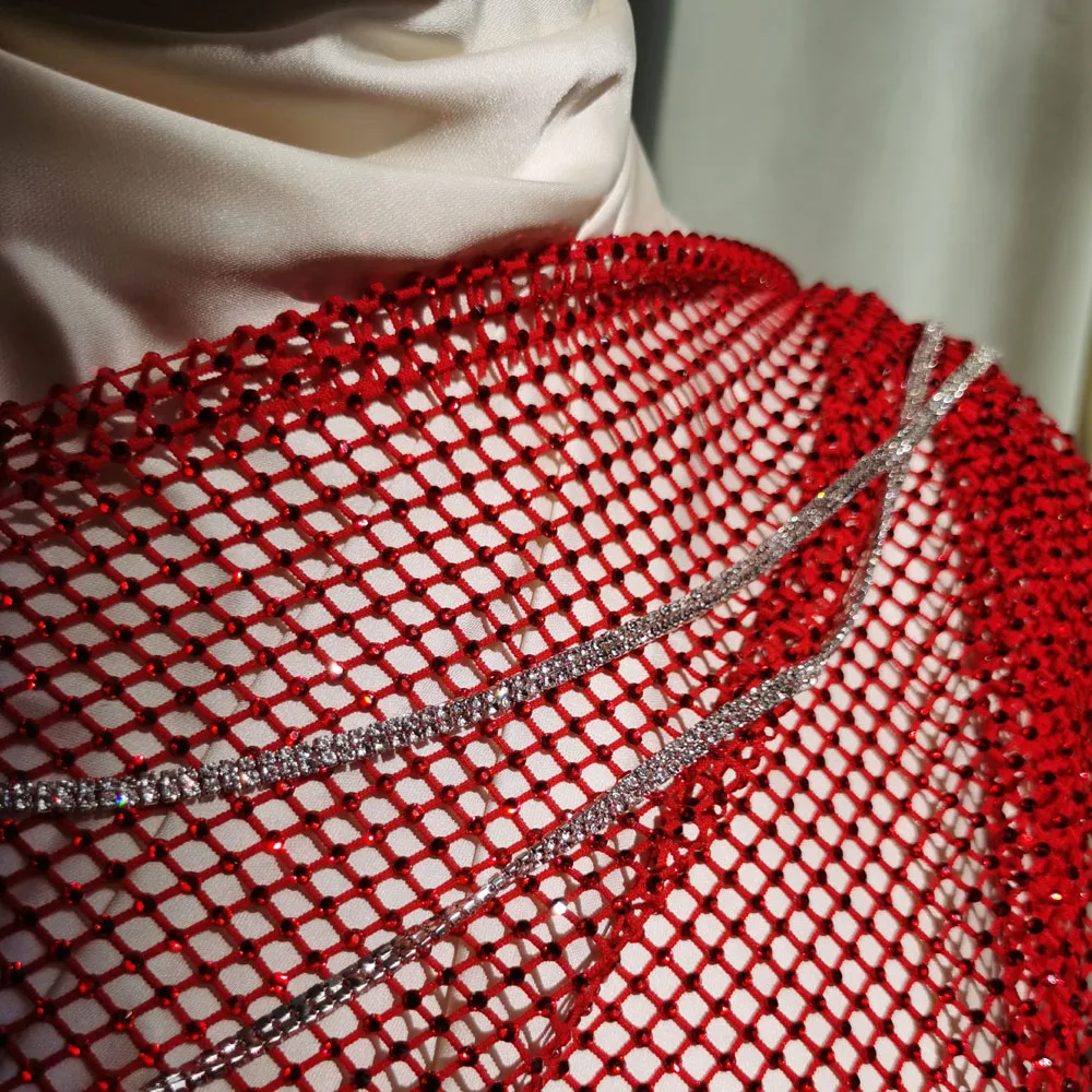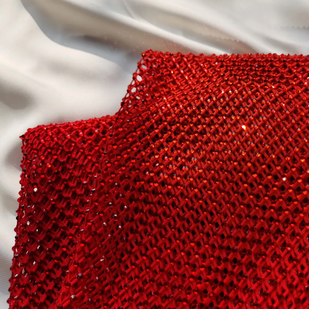Mesh - Polyester Strass Size and Color - SS 10 / Red Mesh Fabric Dimension - 50 X150cm, 100 X150cm Please contact us for more details: email: stepbystep6688@163.com whatsapp: +86 13817723018
