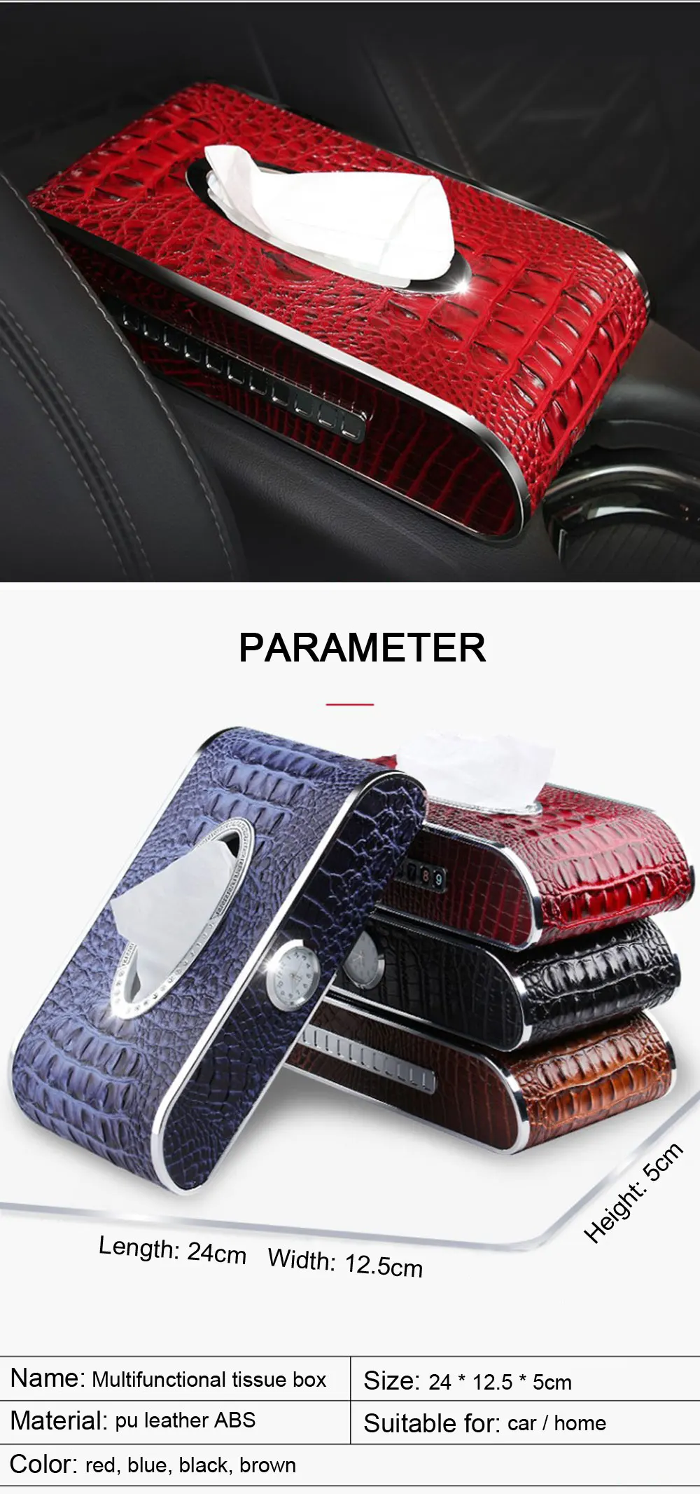 Название: многофункциональная коробка для салфеток Подходит для: автомобиля/дома Размер: 24*12,5*5 см Материал: искусственная кожа ABS Цвет: красный, синий, черный, коричневый Упаковка: 1 шт.