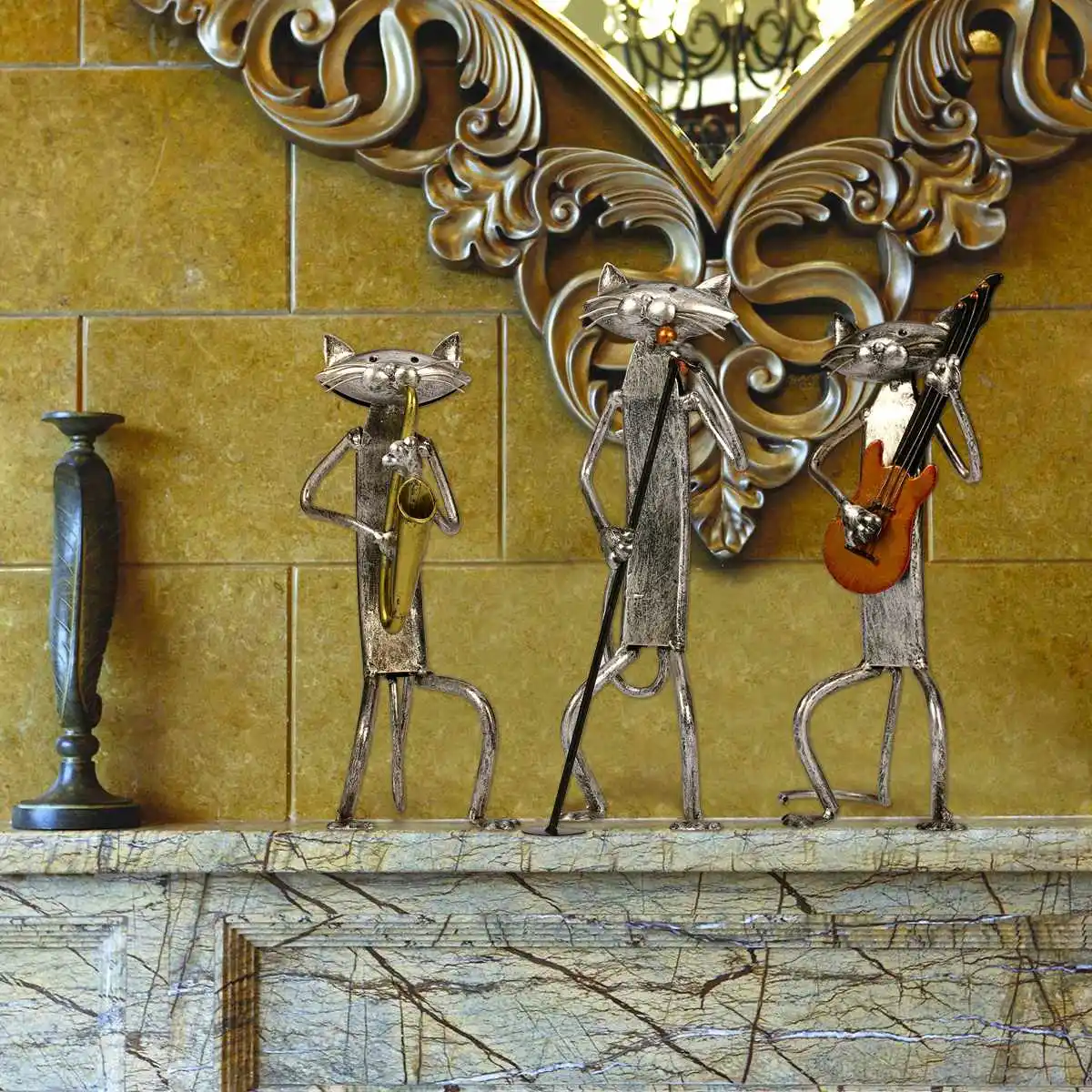 Это металлическая скульптура кошки, которая играет на гитаре, полностью ручная работа опытного старого кузнеца. Качество изготовления выглядит опытным, а красивая и экологичная краска сохраняет его нержавеющим и плавным. Этот гитарный Кот сотрудничает со своим напарником.