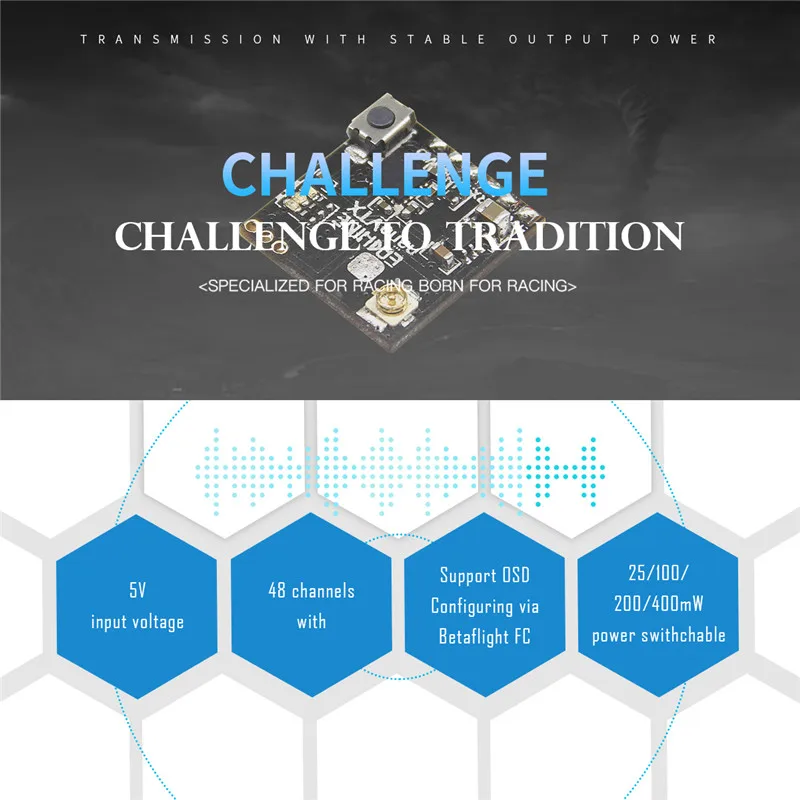 Eachine VTX является имитацией 5,8G ISM полоса пропускания со стабильной выходной мощности,Дальность передачи и мощный фильтр питания. Он может гарантировать, что на изображении нет снежинки, нет полос при максимальной дроссельной заслонки.