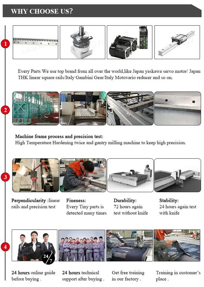 1. Импортный тайваньский квадратный линейный направляющий и японский Серводвигатель обеспечивают высокую точность, быструю скорость резки и стабильную работу;